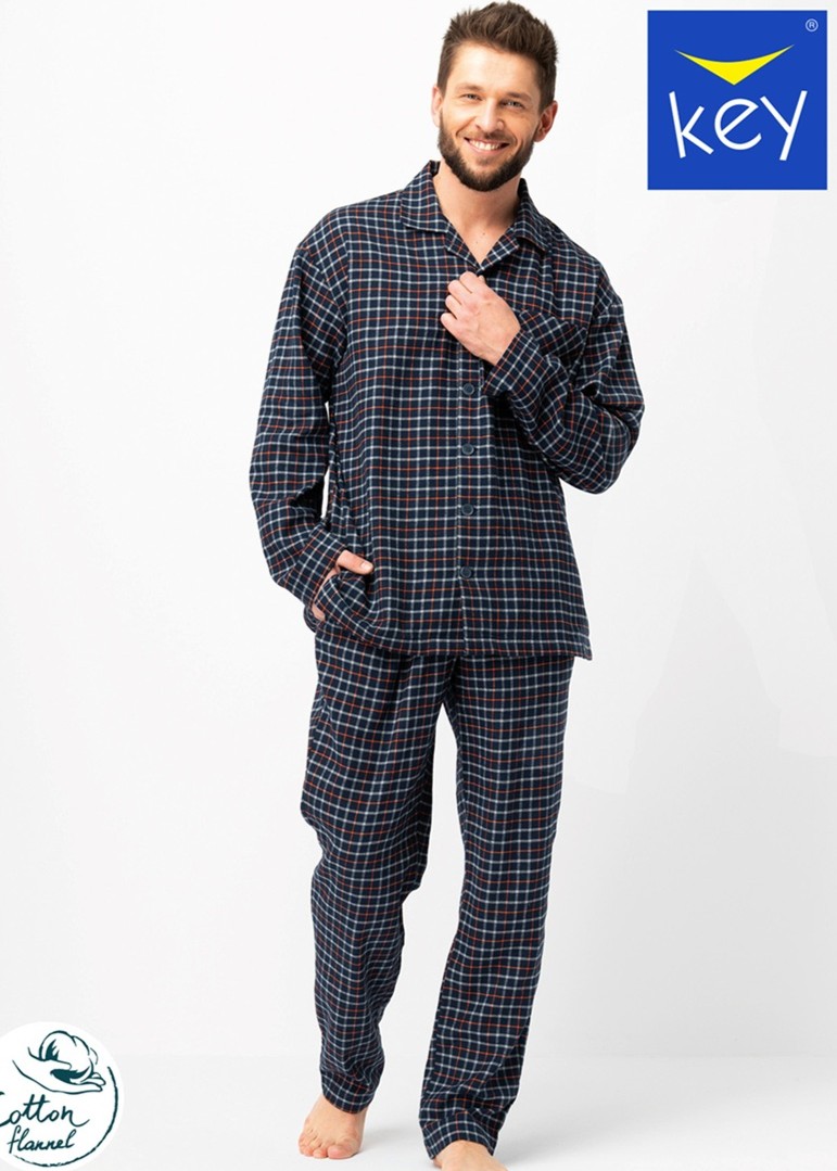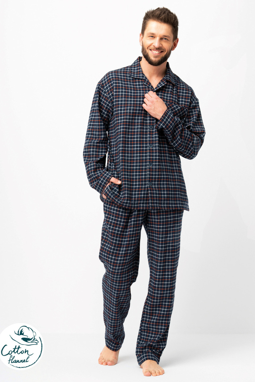 Класична чоловіча фланелева піжама. Сорочка має комір на ґудзиках і нагрудну кишеню. Непомітний ґудзик дозволяє застібати сорочку високо на шиї. Зручні штани злегка звуженого крою. 100% бавовна.