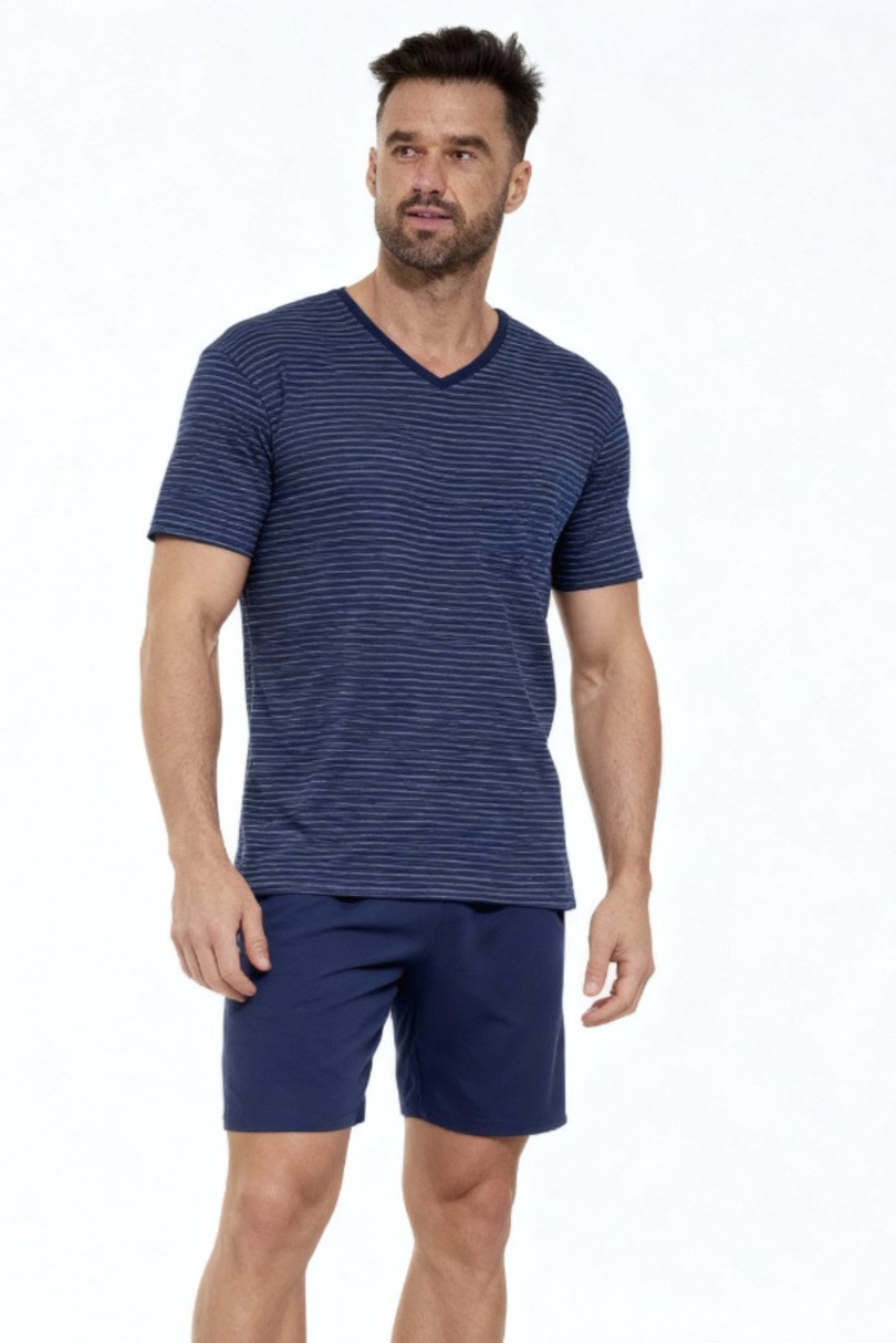 Чоловіча піжама KR 330 W/26 – це класичний та зручний варіант для теплих вечорів, що поєднує в собі позачасовий стиль та високий комфорт. Модна футболка з короткими рукавами в смужку та V-подібним вирізом надає виробу елегантного, чоловічого вигляду та забезпечує свободу рухів. Суміш бавовни та поліестеру м’яка, приємна на дотик та стійка до розтягування. Короткі однотонні шорти, виготовлені зі 100% натуральної бавовни, гарантують повітропроникність та комфорт навіть у спекотні ночі. Еластичний пояс з бавовняною обробкою ідеально прилягає до тіла, не створюючи тиску. Піжама KR 330 W/26 – чудовий вибір для сну та відпочинку вдома, а також є практичним подарунком для чоловіків.