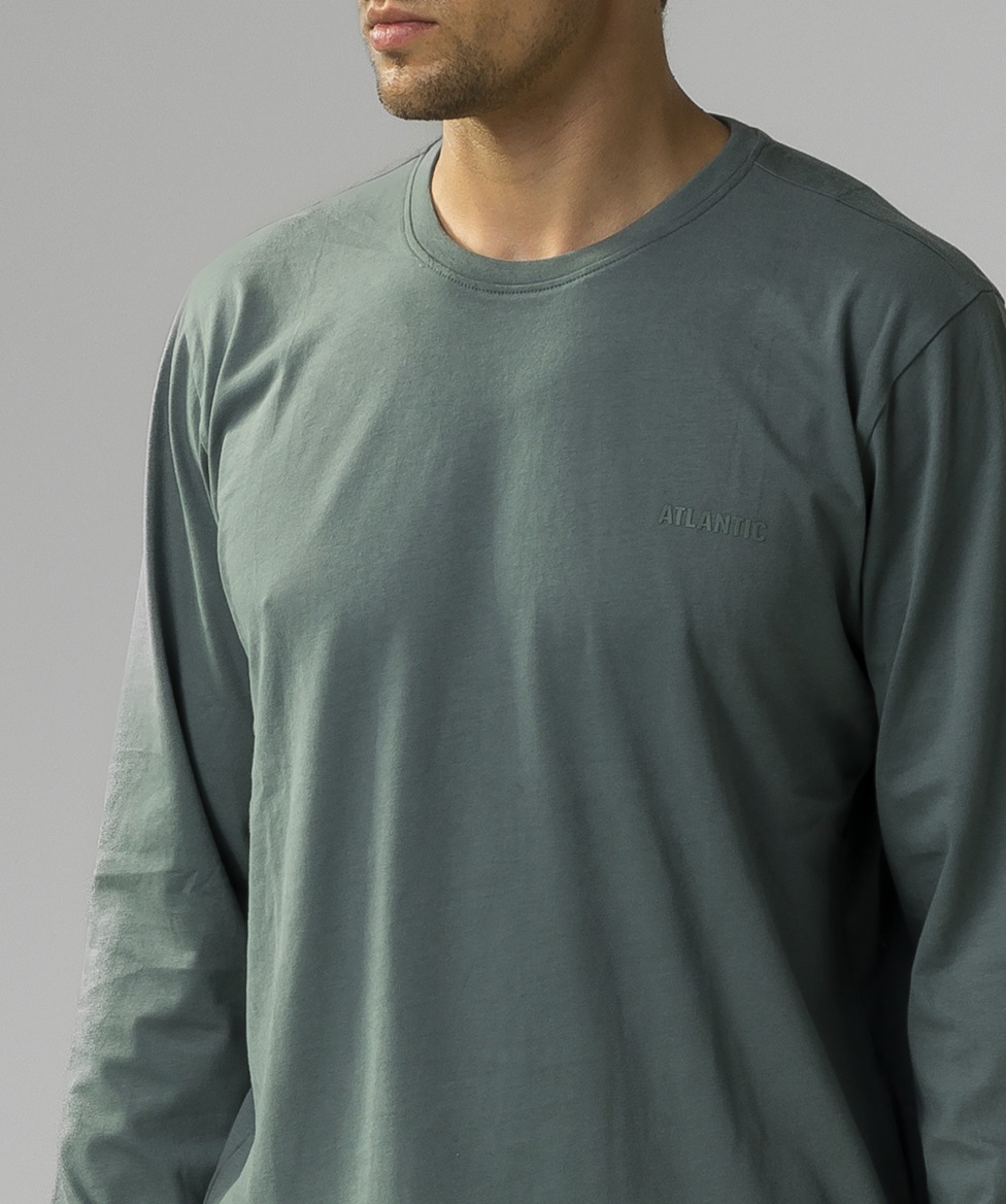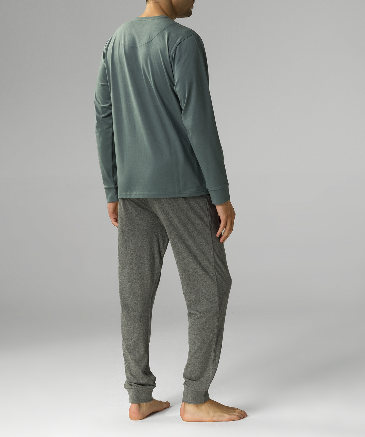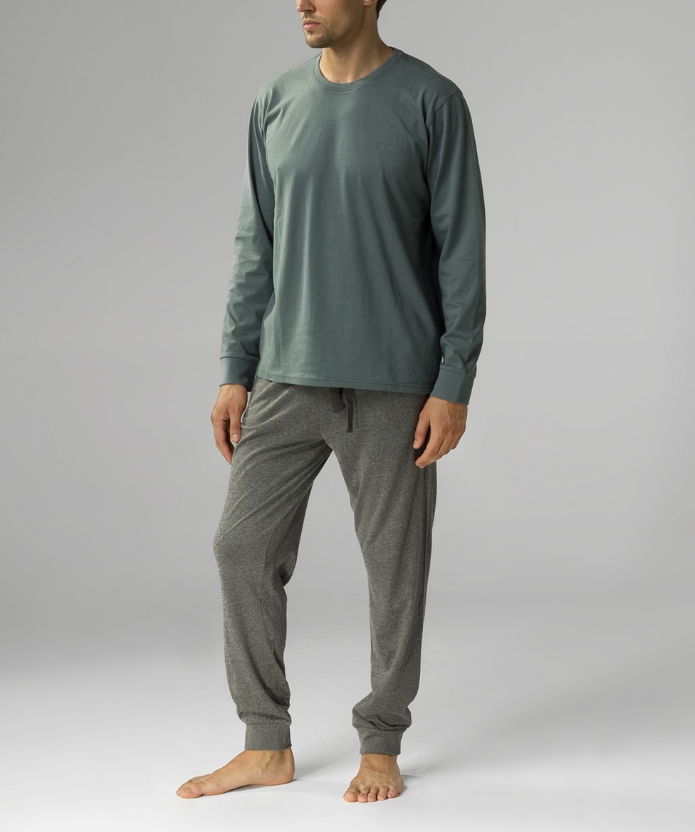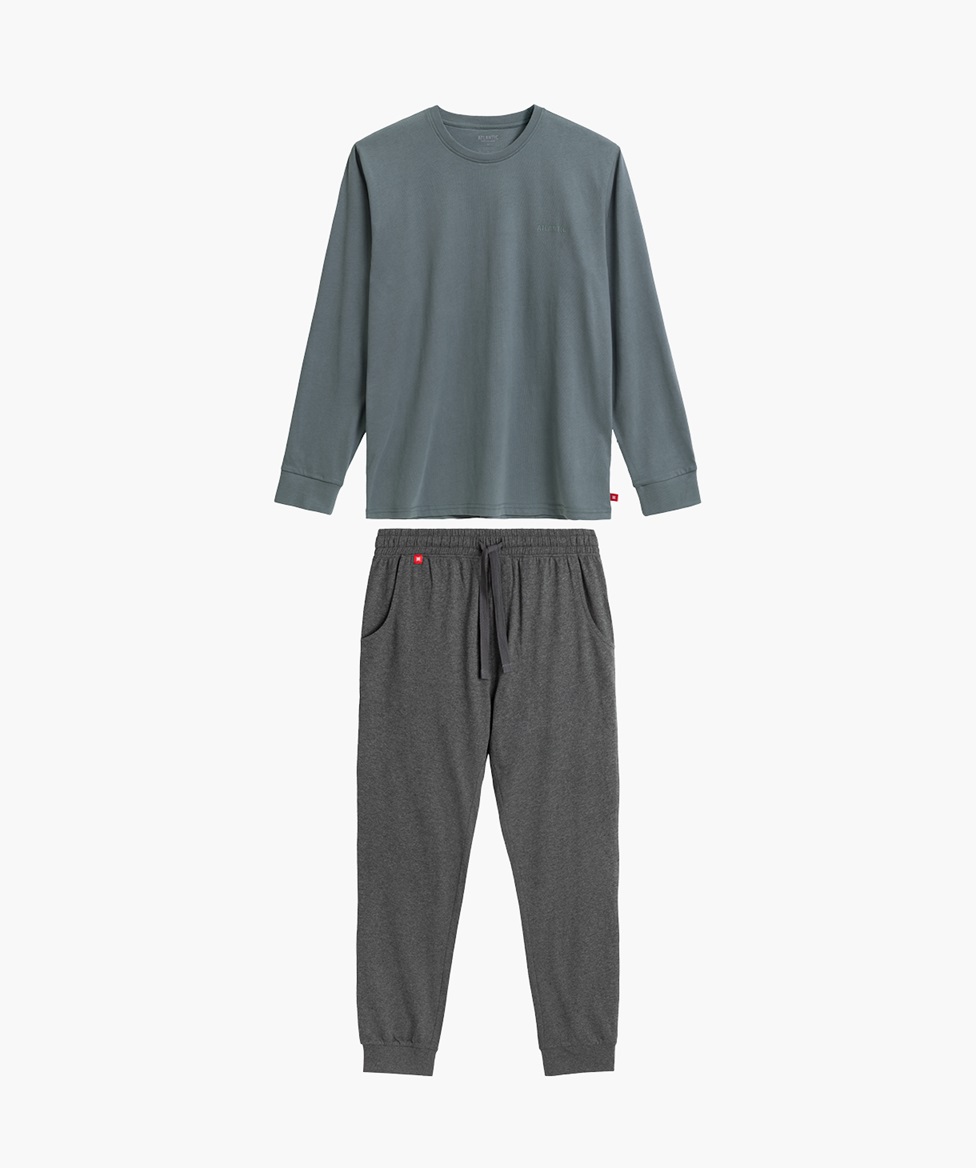 Чоловіча піжама трохи оверсайз з м'якої бавовни з персиковим ефектом. Светр має круглий виріз горловини та ребристі манжети. Штани вільного крою мають кишені та ребристі манжети. 100% бавовна.