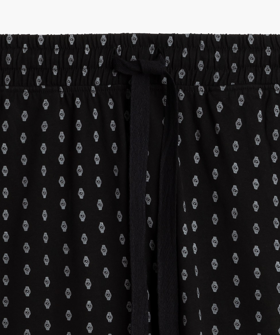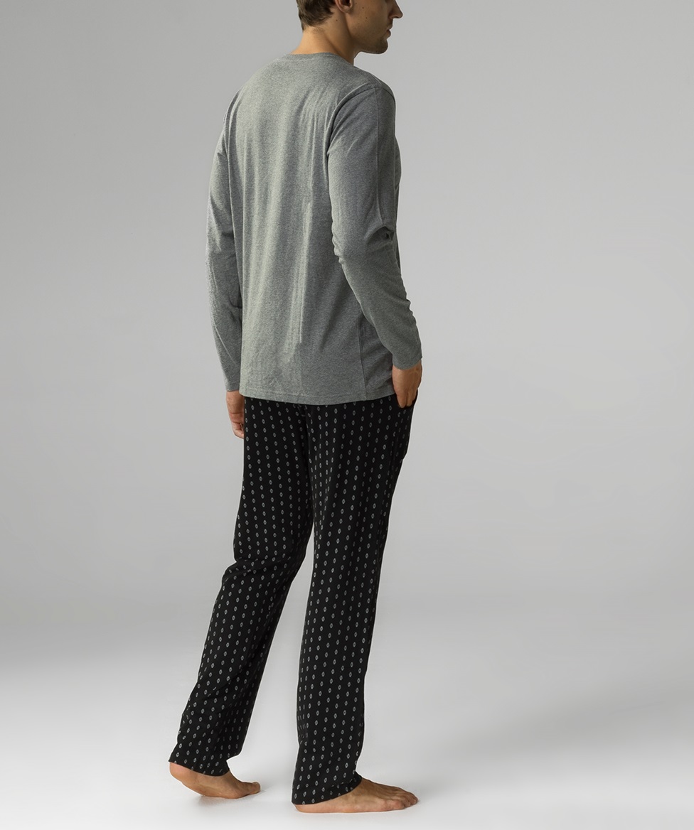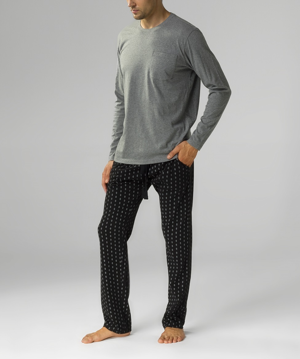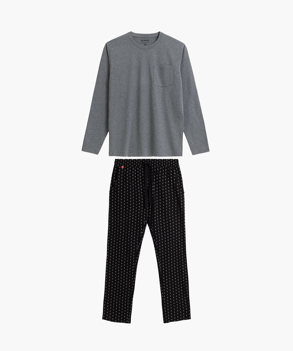 Чоловіча піжама трохи оверсайз з м'якої бавовни з персиковим ефектом. Светр з круглим вирізом та ребристими манжетами. Штани вільного крою з візерунком, кишенями та ребристими манжетами. 100% бавовна.