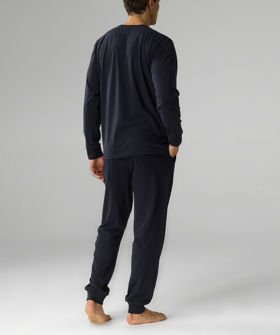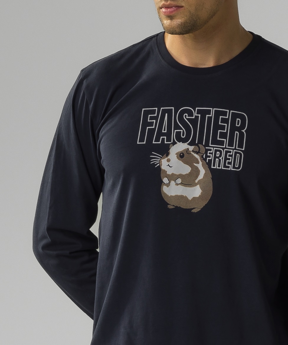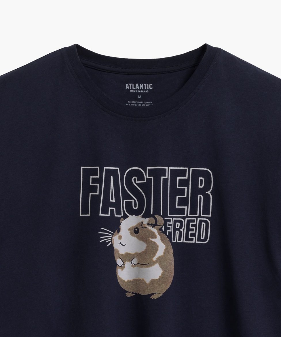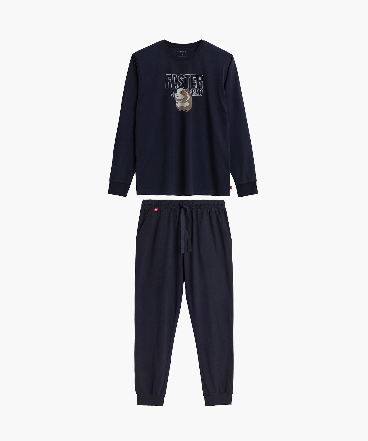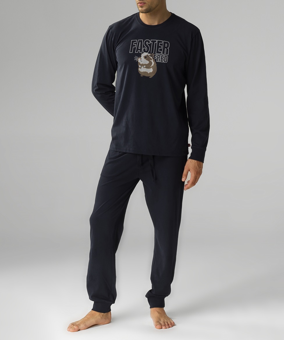 Чоловіча піжама трохи оверсайз з м'якої бавовни з персиковим ефектом. Светр має круглий виріз горловини, ребристі манжети та грайливий візерунок із зображенням хом'яка. Штани вільного крою мають кишені та ребристі манжети. 100% бавовна.