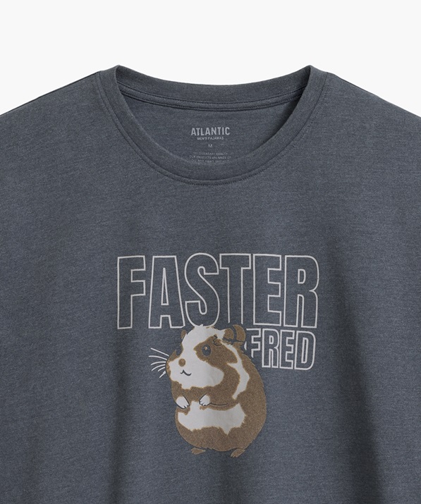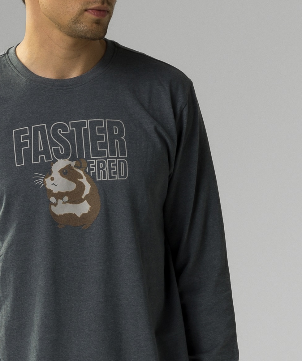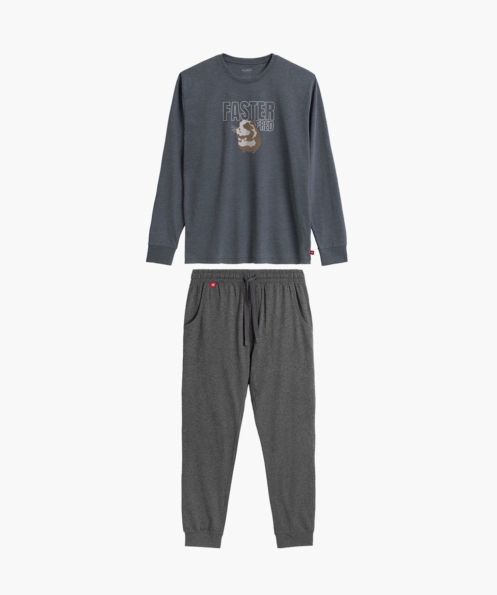Чоловіча піжама трохи оверсайз з м'якої бавовни з персиковим ефектом. Светр має круглий виріз горловини, ребристі манжети та грайливий візерунок із зображенням хом'яка. Штани вільного крою мають кишені та ребристі манжети. 100% бавовна.