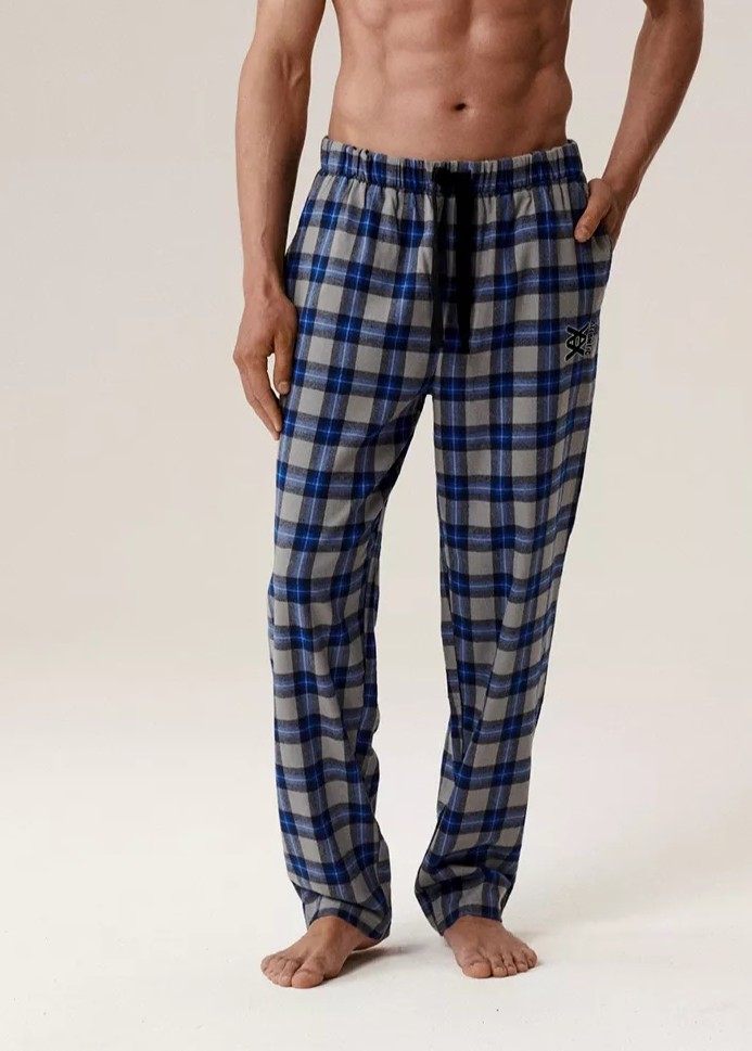 Теплі фланелеві штани для сну та відпочинку вдома. Мають регульований пояс на шнурку для ідеальної посадки, практичні бічні кишені та вільний крой штанин. Склад: 100% бавовна.