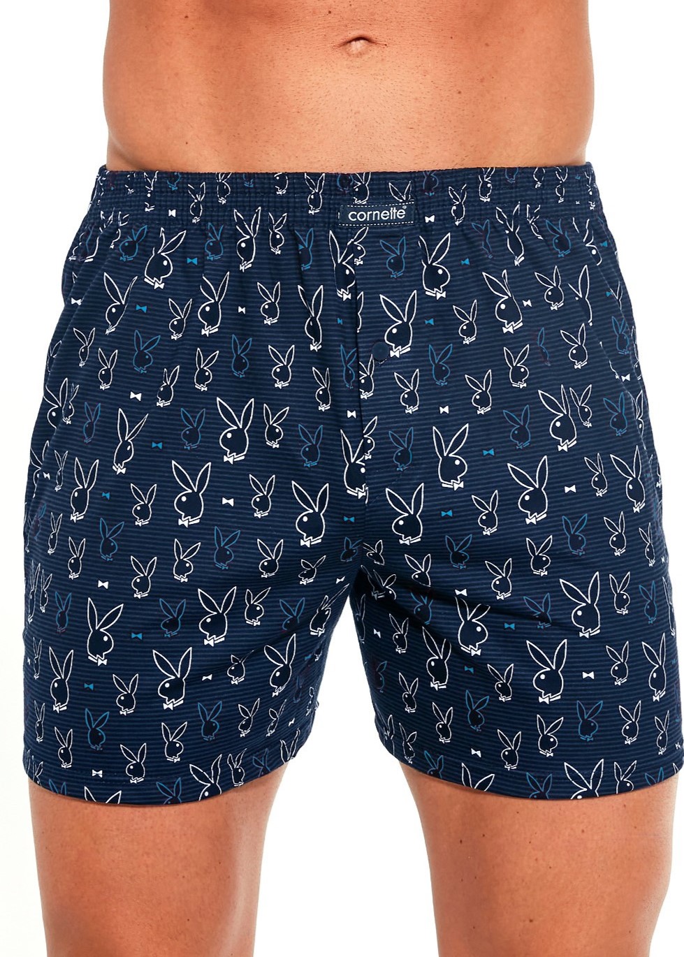 Чоловічі боксерські шорти вільного крою з грайливим принтом у вигляді зайчика. Зручний еластичний пояс з бавовняною обробкою. Застібається на ґудзики. 100% бавовна.
