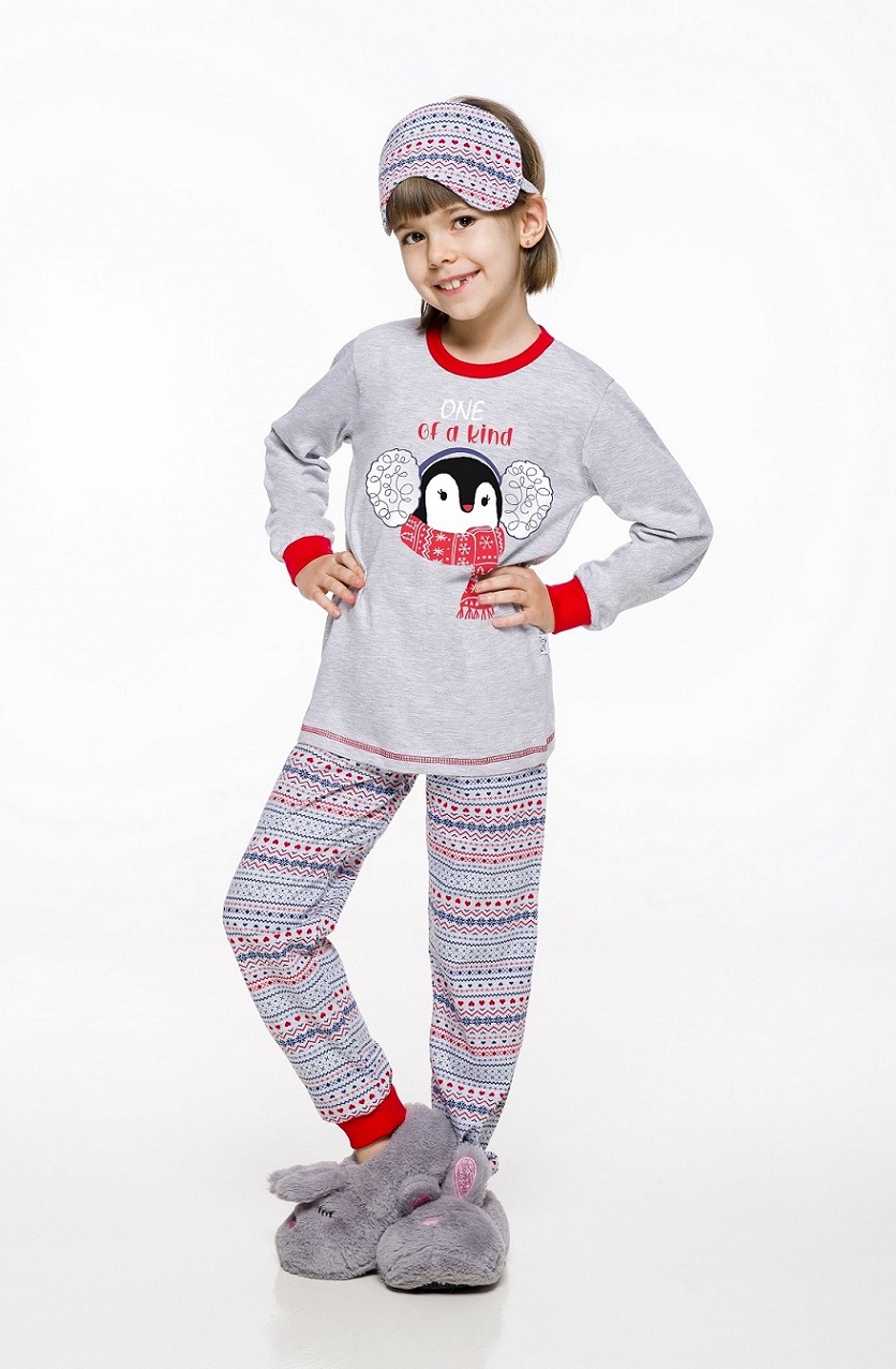 Піжама для дівчат з високоякісної бавовни. Футболка з довгими рукавами з ранцем, прикрашена відбитком. Довгі штани з візерунком з манжетами. Склад: 92% бавовна, 8% еластан.