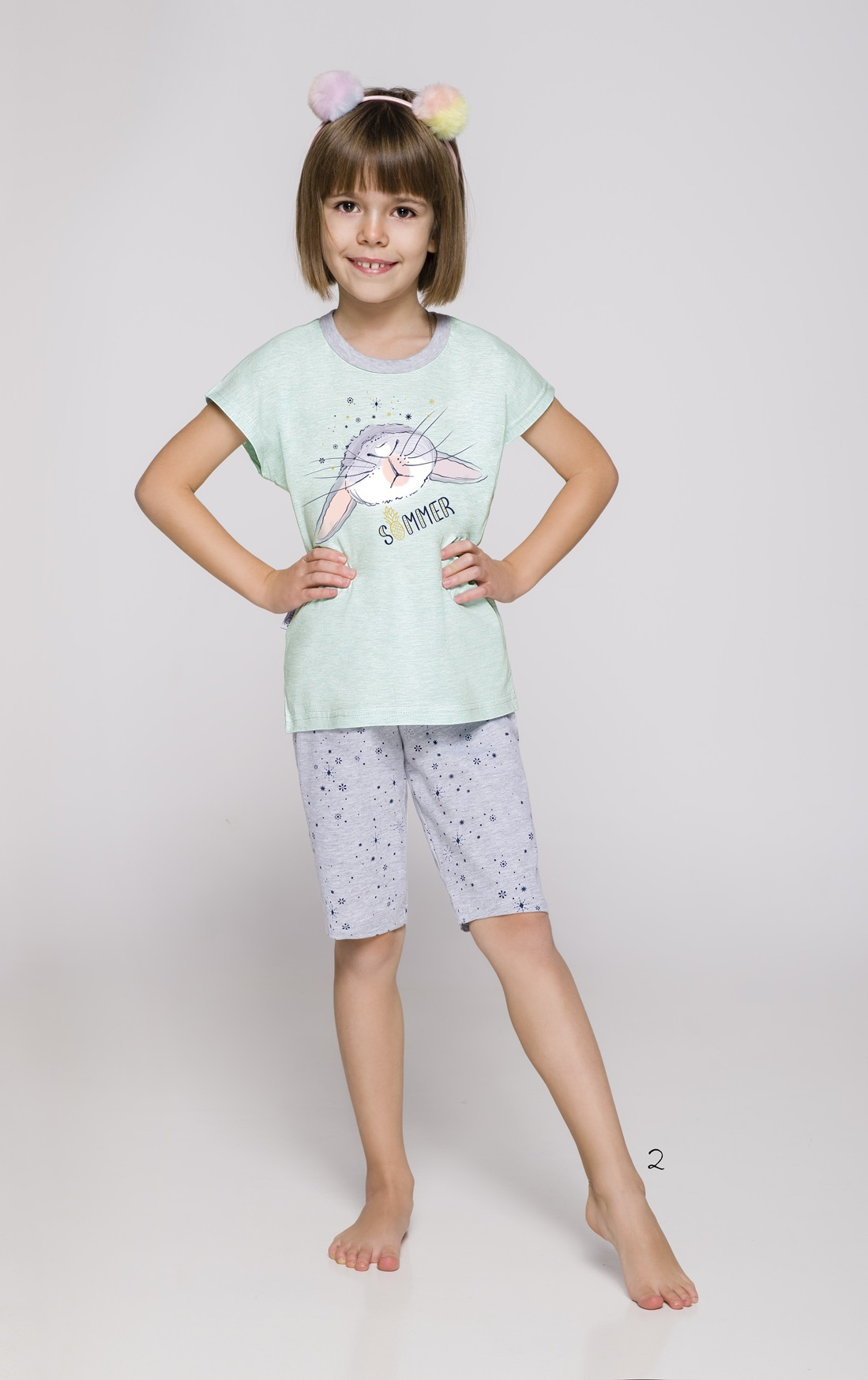 Піжами для дівчат з короткими рукавами. Футболка з малюнком, декольте та рукава, оброблені трубами в контрастному кольорі. 3/4 штани. Склад: футболка біло-рожевого кольору 100% бавовна; штани 95% бавовна, 5% поліестер, біло-червоний колір 100% бавовна.