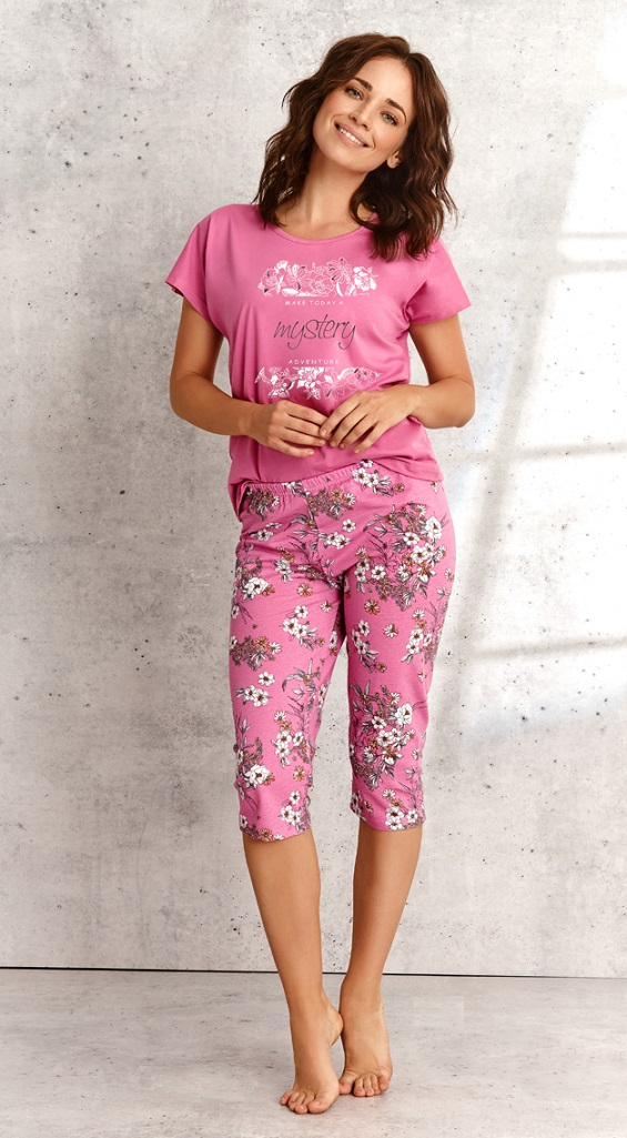 Жіноча піжама з високоякісного бавовни. Футболка з короткими рукавами, прикрашена відбитком. Штани з малюнком 3/4 довжини. Склад: 100% бавовна.