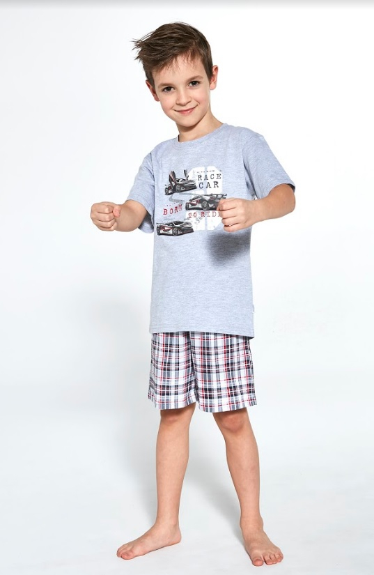 Піжама для хлопчика з якісної м'якої бавовни. Футболка з коротким рукавом, спереду прикрашена кольоровим принтом. шорти в клітку. Упакований в коробку. Склад: футболка 92% бавовна, 8% поліестер; шорти 100% бавовна.