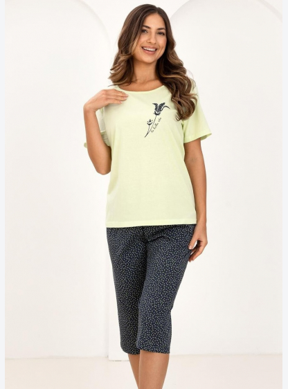 Жіноча бавовняна піжама злегка вільного крою. Футболка має короткі рукави, круглий виріз горловини т..