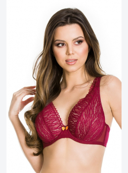 М'який бюстгальтер у стилі бралет. Бралет виготовлений з бордового мережива та прикрашений контрастн..