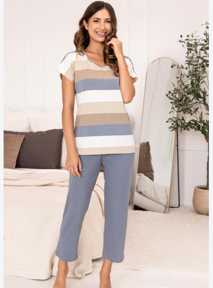 Жіноча піжама з віскози ідеально сидить. Смугаста футболка має короткі рукави та круглий виріз горло..