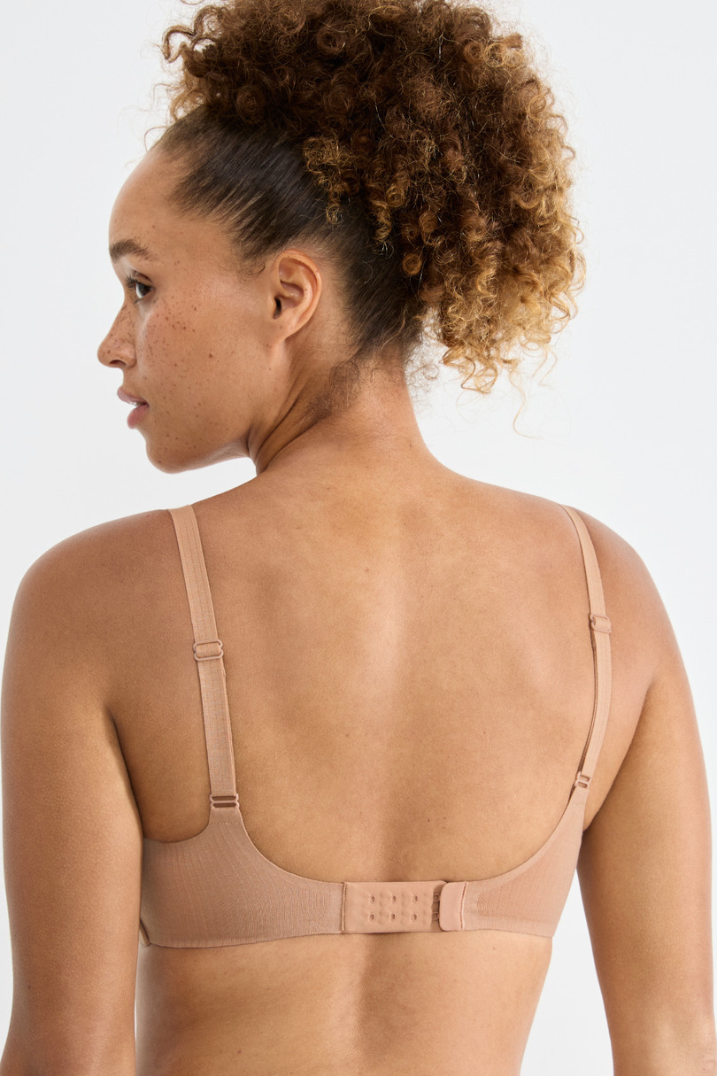 Цей елегантний бюстгальтер карамельно-телесного кольору розроблений для щоденного комфорту та витонченого підкреслення силуету. Контурні чашечки ніжно моделюють груди, забезпечуючи природну підтримку без кісточок. Легка, еластична тканина повторює форму тіла, а гладка обробка гарантує, що бюстгальтер залишається непомітним під одягом. Регульовані бретельки забезпечують ідеальну посадку, що робить його ідеальним вибором для щоденного використання. 36% поліестер, 34% модал, 15% поліамід
