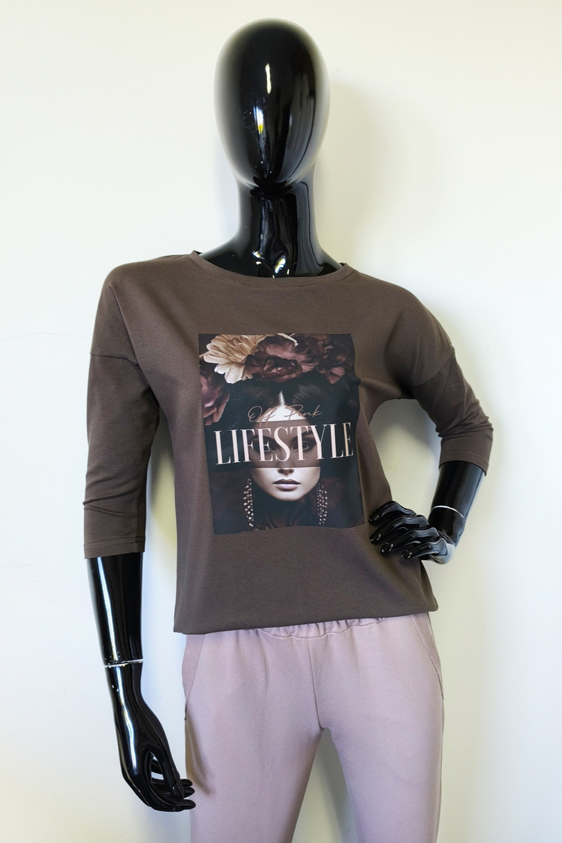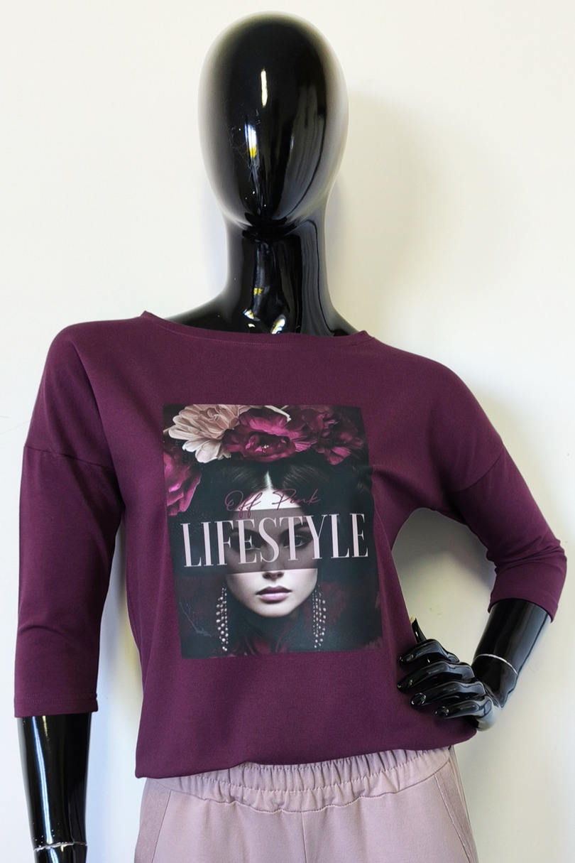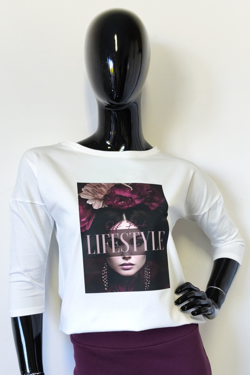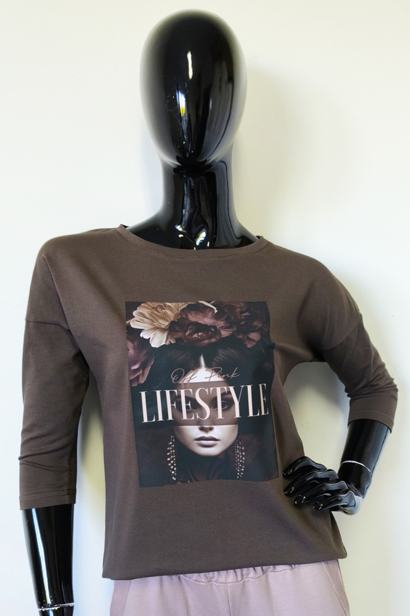 Ця стильна жіноча блузка з рукавами 3/4 поєднує в собі комфорт та сучасний дизайн. Виготовлена з високоякісного трикотажу (95% бавовни, 5% еластану), вона м'яка, еластична та приємна на дотик. Подовжена, заокруглена спинка додає їй особливого вигляду. Модний принт спереду додає унікальності. Ідеально підходить для щоденного носіння, роботи або зустрічі з друзями.