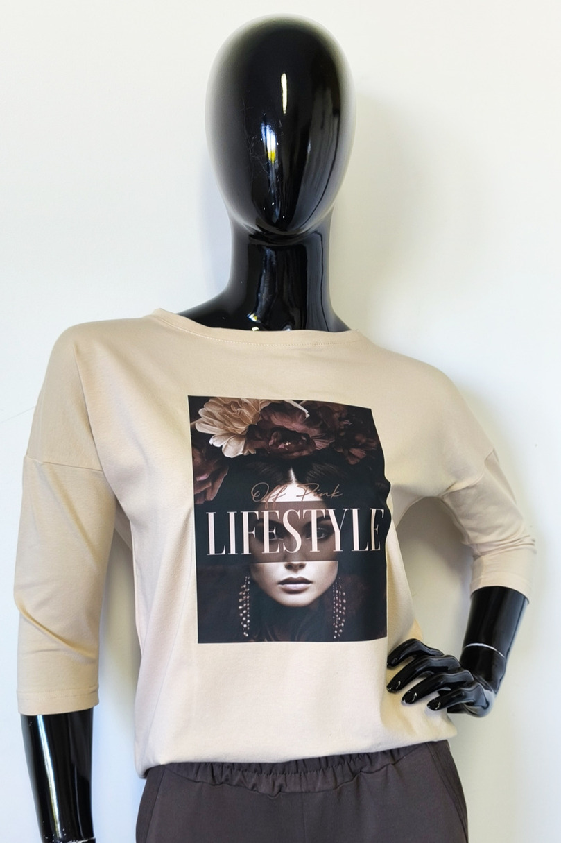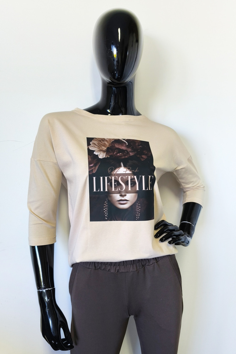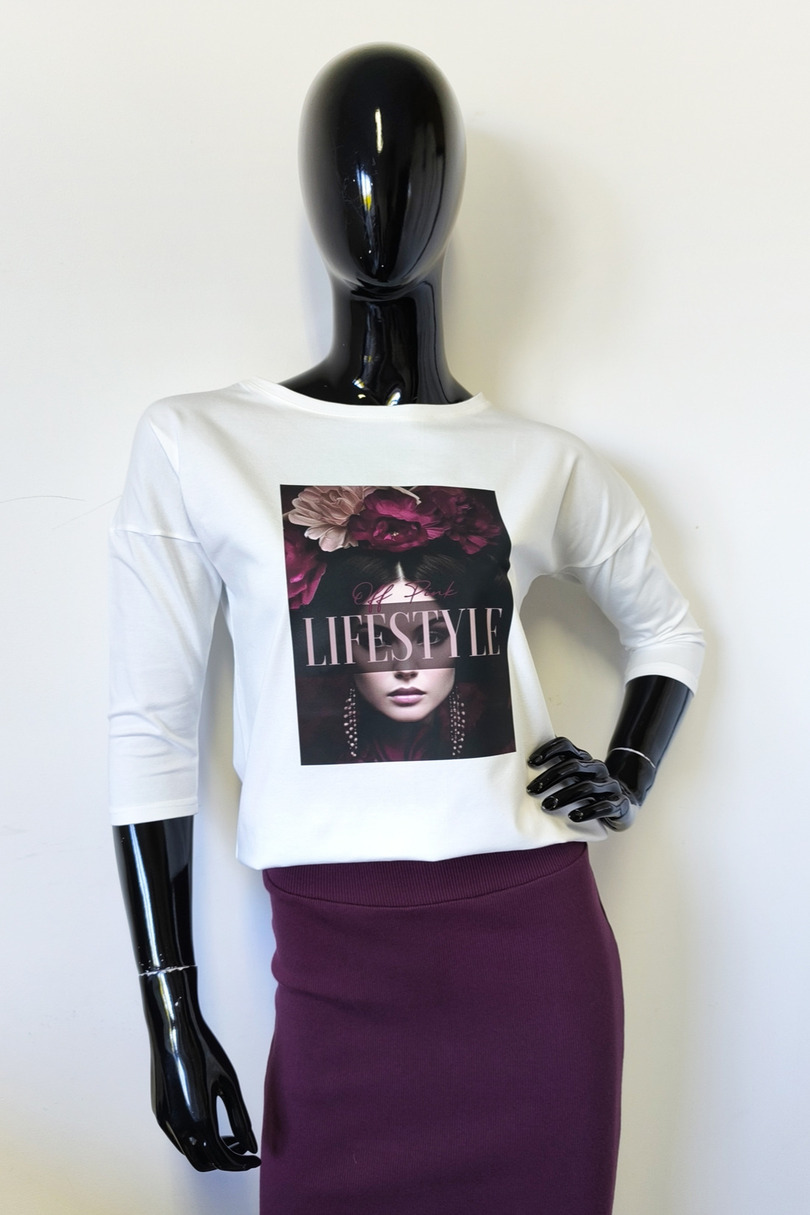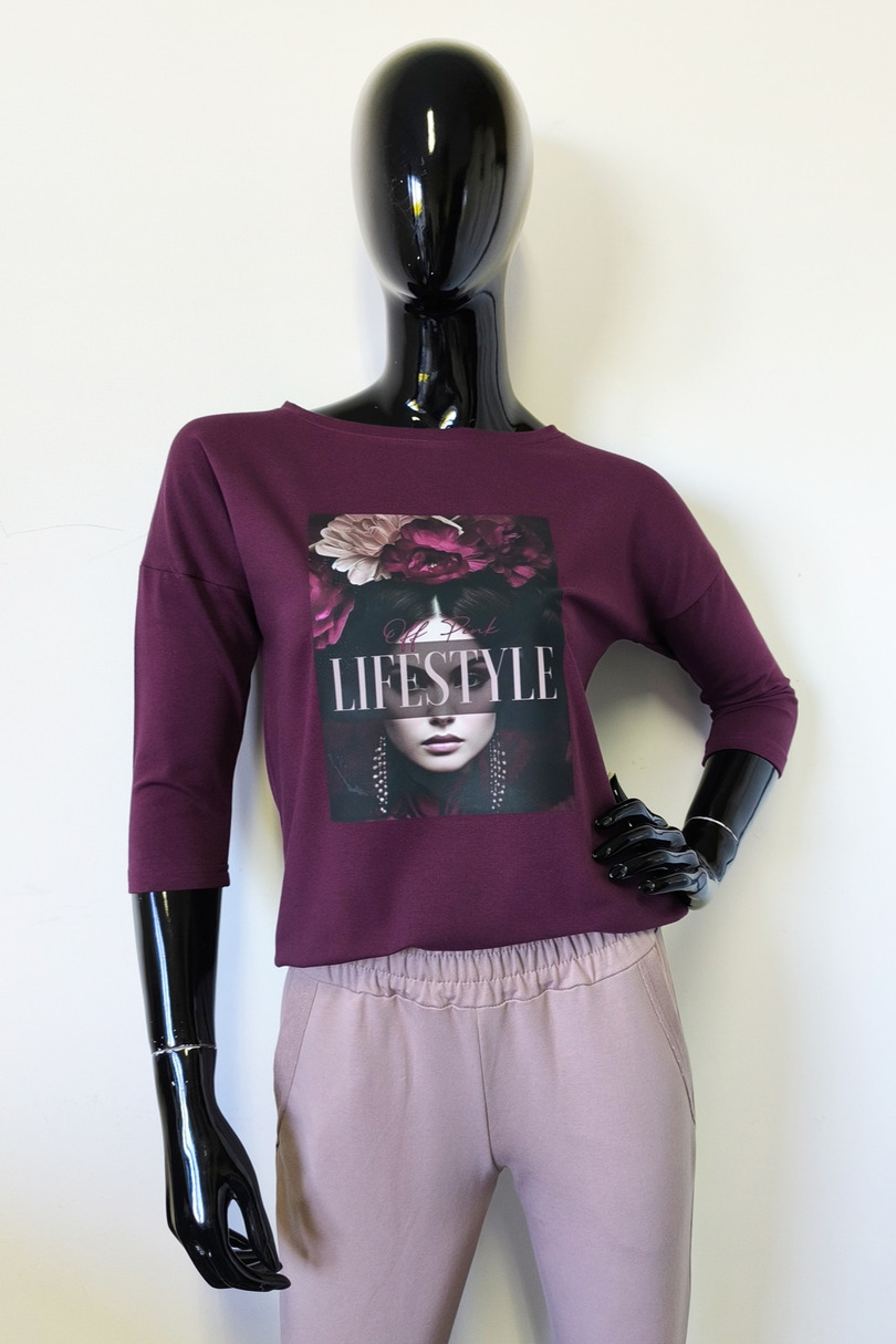 Ця стильна жіноча блузка з рукавами 3/4 поєднує в собі комфорт та сучасний дизайн. Виготовлена з високоякісного трикотажу (95% бавовни, 5% еластану), вона м'яка, еластична та приємна на дотик. Подовжена, заокруглена спинка додає їй особливого вигляду. Модний принт спереду додає унікальності. Ідеально підходить для щоденного носіння, роботи або зустрічі з друзями.