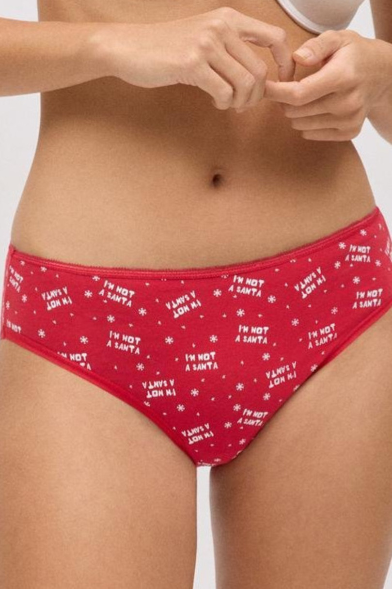 Ці жіночі різдвяні трусики яскраво-червоного кольору – це поєднання комфорту та святкового настрою. Виготовлені з м’якої, дихаючої бавовни з додаванням еластану, вони гарантують ідеальну посадку та комфорт протягом усього дня. Дрібний принт з написом «Я не Санта» та мотив сніжинки додають унікальності. Класичний крій забезпечує комфорт та свободу рухів, а еластичний пояс – ідеальну посадку. Вони чудово підійдуть для зимових днів або як чарівний святковий подарунок. Матеріал: 80% бавовна, 20% поліестер