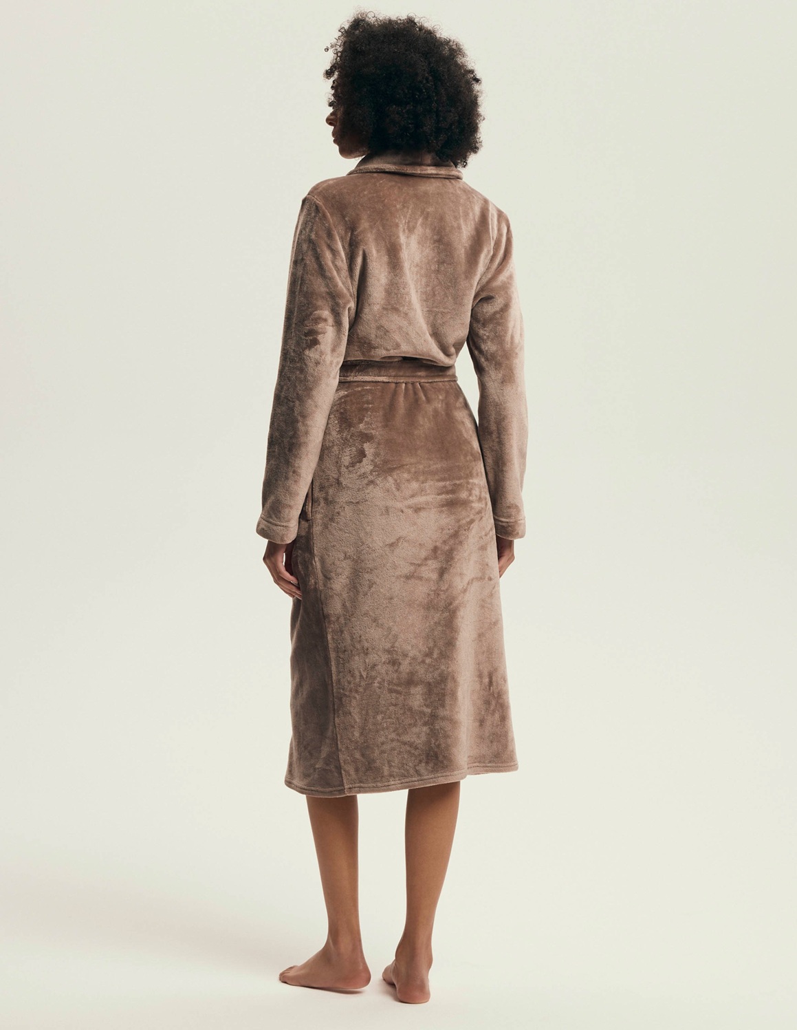 Жіночий халат з коміром, виготовлений з м'якої, гладкої трикотажної тканини. Він трохи нижче коліна, має довгі рукави та зав'язки на талії. Дві зручні зовнішні кишені. Склад: 100% поліестер.