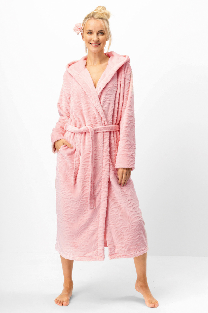 Цей елегантний довгий жіночий халат з тисненням виготовлений з надзвичайно м'якої та пухнастої тканини, що забезпечує довговічність та комфорт. Він має капюшон, глибокі передні кишені та широкий пояс. Склад: 100% поліестер.