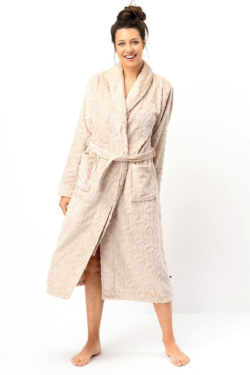 Цей елегантний довгий жіночий халат виготовлений з надзвичайно м'якої та пухнастої тканини, що забезпечує довговічність та комфорт. Має тиснений візерунок, глибокі передні кишені та широкий пояс. Склад: 100% поліестер.