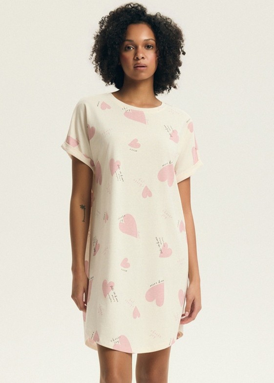 Жіноча бавовняна сорочка з візерунком у формі серця. Вільний крій, короткі рукави, круглий виріз горловини та злегка заокруглений поділ. Склад: 100% бавовна.