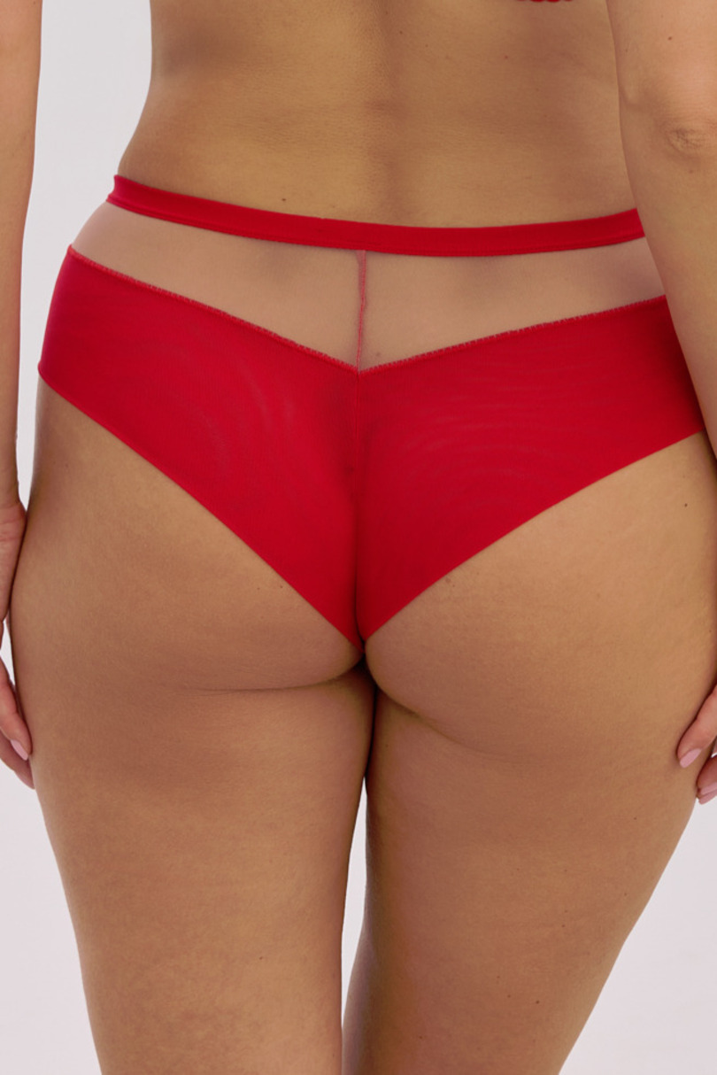Ці чуттєві червоні бразильянки – це поєднання елегантності та жіночної впевненості. Передня частина, виготовлена з яскравого квіткового мережива, ніжно прикрашає тіло та підкреслює його вигини. Гладка задня частина з мікрофібри ідеально адаптується до фігури, забезпечуючи максимальний комфорт та м'якість. Вищий виріз спереду візуально зменшує талію, а ніжний бант додає романтичного відтінку. Це ідеальний вибір для жінок, які цінують чуттєву та водночас зручну білизну. 75% поліамід, 15% еластан, 10% бавовна
