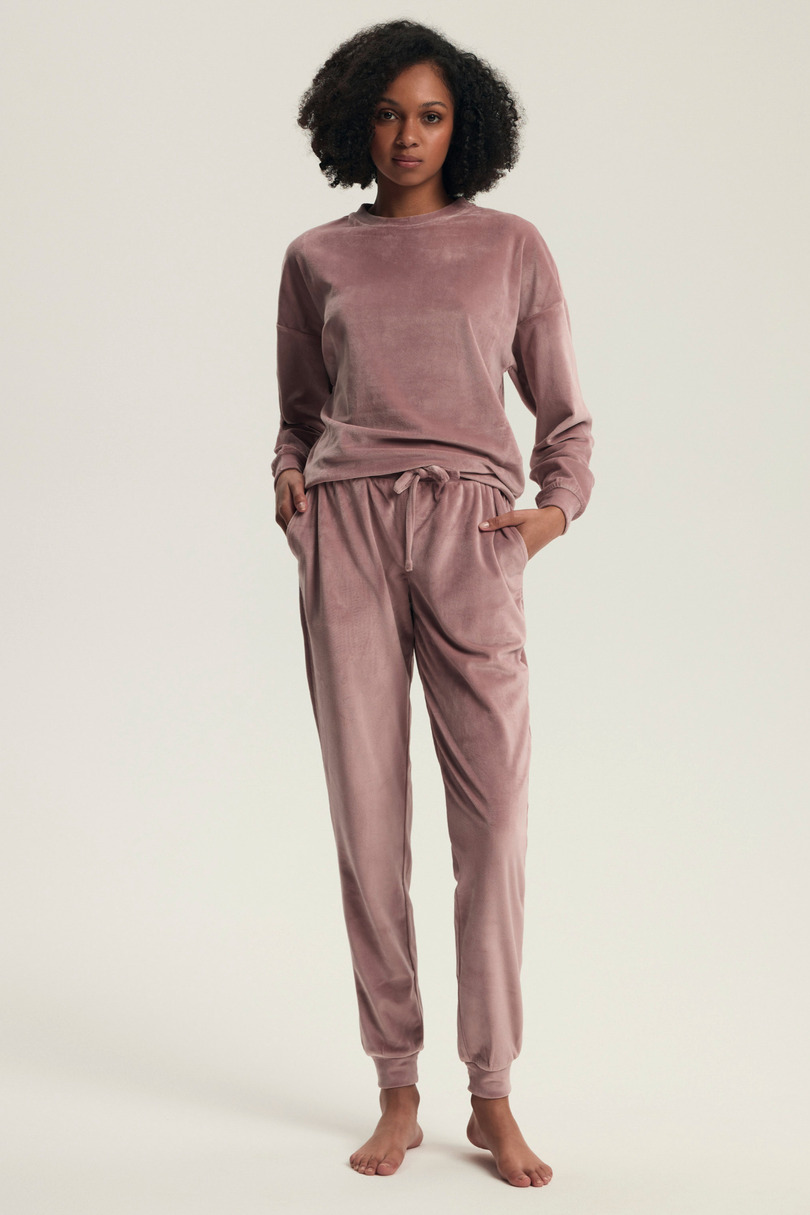 Вільний, зручний жіночий оксамитовий спортивний костюм. Светр має довгі рукави та круглий виріз горловини. Штани довгі та суцільні. Низ, рукави та штанини ребристі. Склад: 95% поліестер, 5% еластан.