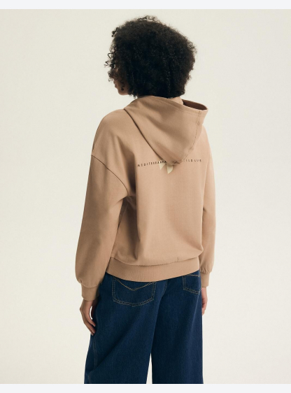 Жіноча бавовняна толстовка з капюшоном та довгими рукавами. Ребристі манжети та поділ, а також декор..
