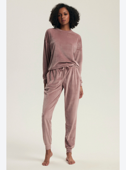 Вільний, зручний жіночий оксамитовий спортивний костюм. Светр має довгі рукави та круглий виріз горл..