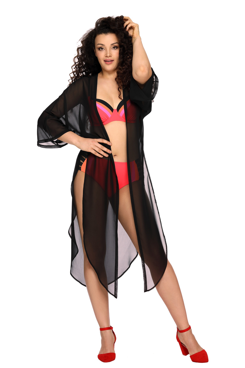 Доповніть свій пляжний образ цією спокусливою шифоновою накидкою середньої довжини з вільними рукавами. Вона приховає будь-які недоліки фігури, а також захистить від сонця. Бічні розрізи до талії дозволяють продемонструвати ноги та стегна, а за потреби передню частину можна використовувати як вишукану краватку. Класичний прозорий чорний колір сам по собі елегантний. Склад матеріалу: 100% поліестер