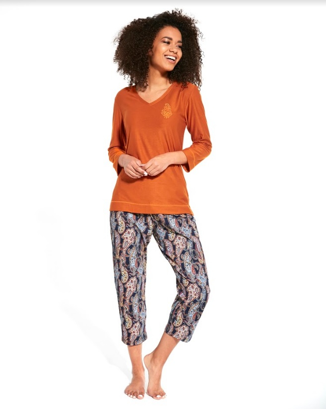 Жіноча піжама з високоякісного бавовни. Футболка з рівномірною формою, з 3/4 рукавами, вишивка на висоті грудей. Штани з малюнком, довжина 7/8. Упакований у коробку. Склад: 100% бавовна.