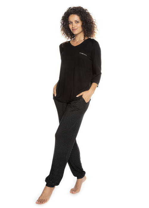 Жіноча піжама з трикотажної віскози. Футболка з довгими рукавами, V-подібним вирізом, прикрашена ніжним написом. У комплект входять довгі штани зі сріблястими зірочками, з кишенями, штани, оброблені ранцем. Склад: 95% віскоза, 5% еластан