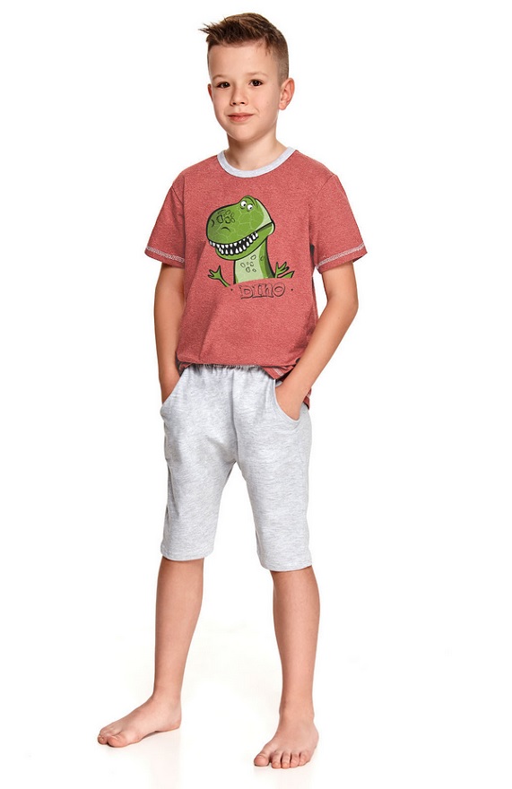 Піжама для хлопчиків виготовлена з якісного, приємного бавовни. Футболка з коротким рукавом, прикрашена кумедним принтом. У комплект входять довші шорти зі зручними кишенями. Склад: футболка 92% бавовна, 8% поліестер; шорти 95% бавовна, 5% поліестер