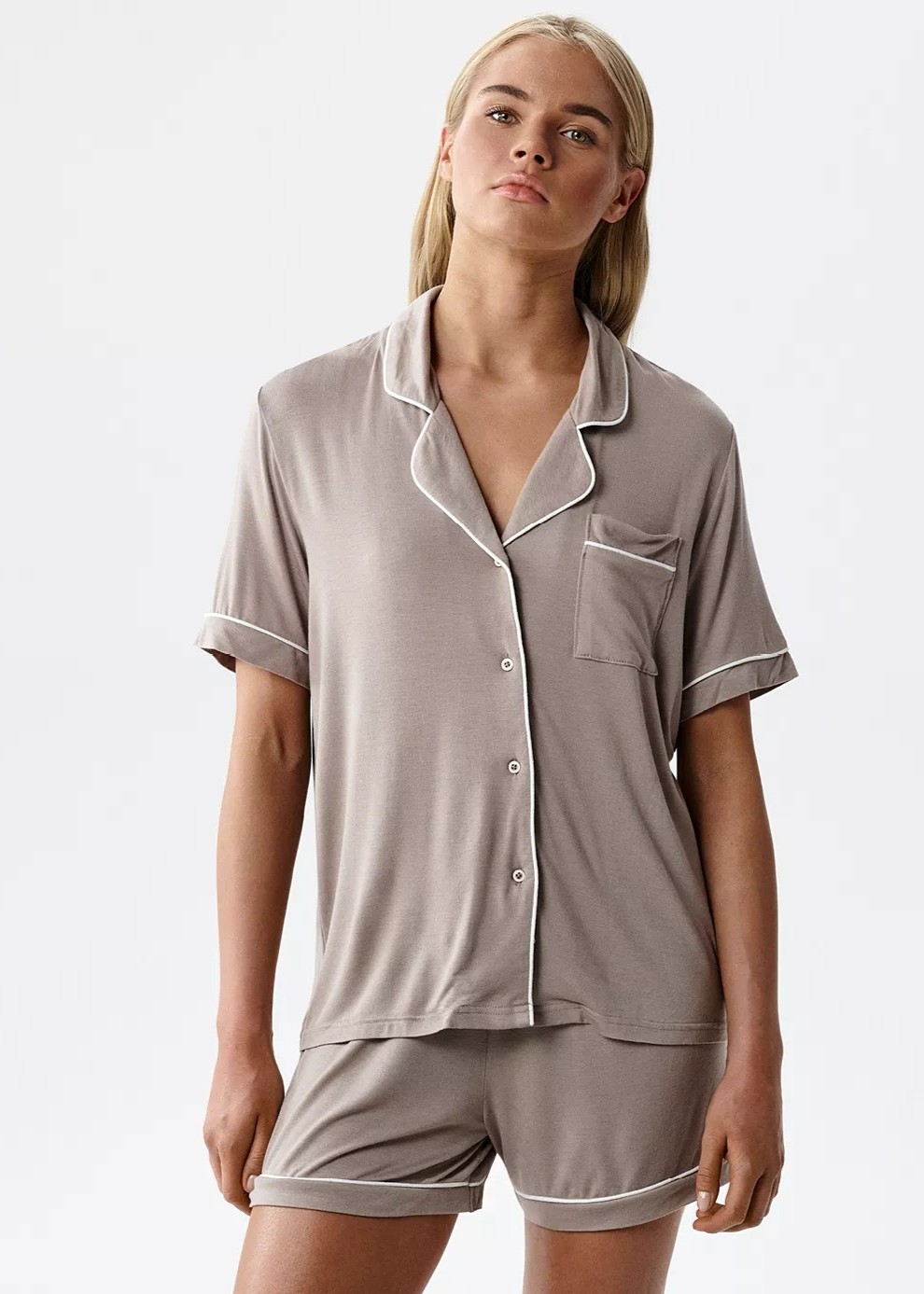 Ця піжама ідеально підходить для весни та літа, виготовлена з надлегкої, дихаючої тканини для максимального комфорту. Ці шорти, доповнені блузкою на ґудзиках, короткими рукавами та V-подібним вирізом, чудово підійдуть до шортів. Склад: 95% модал, 5% еластан.