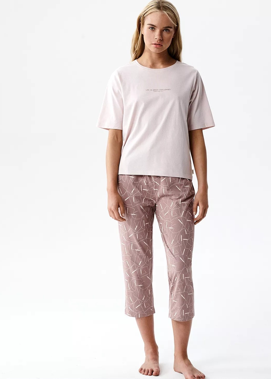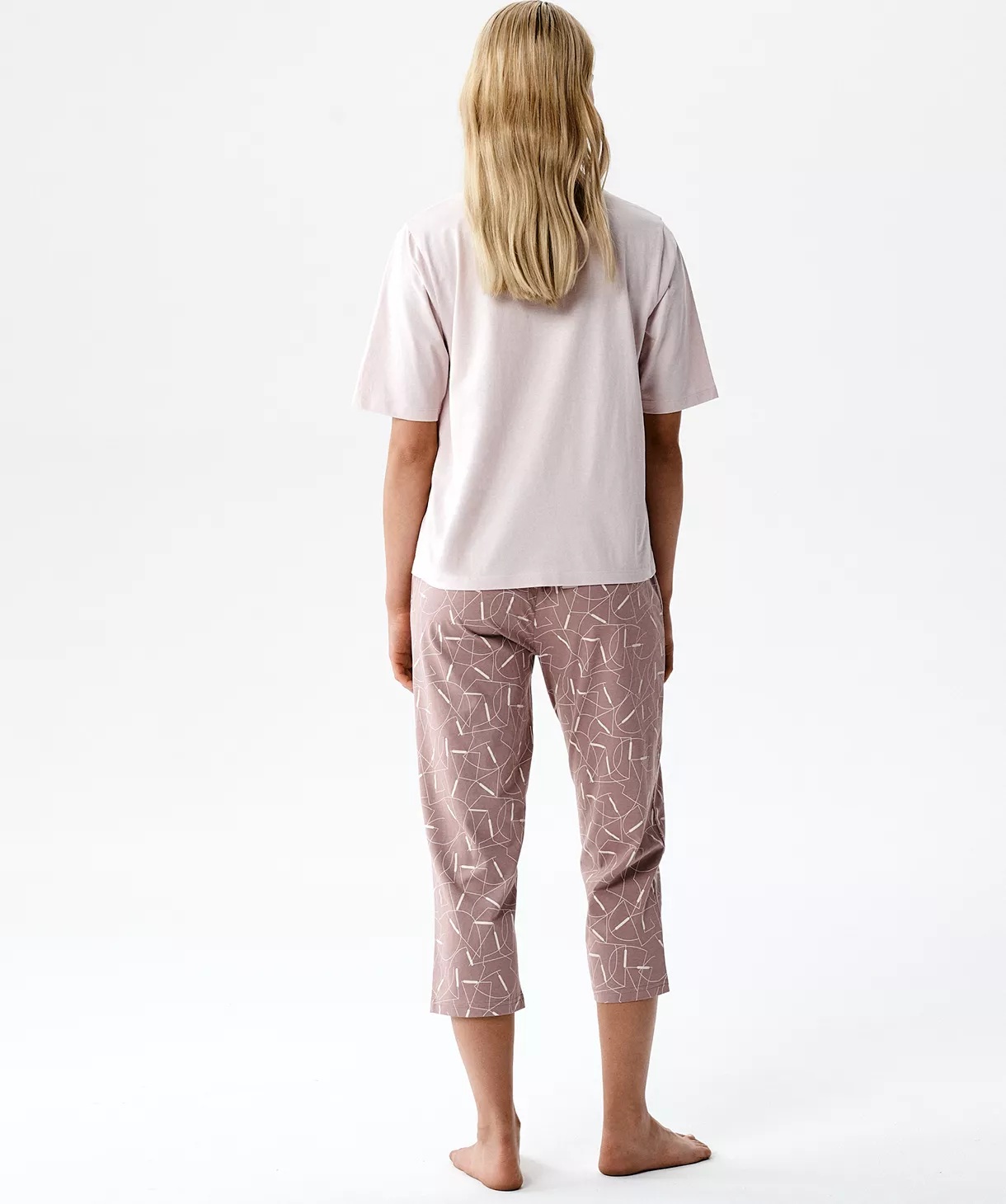 Ця піжама виготовлена з м'якого, зручного та приємного для шкіри бавовняного трикотажу. Вільна, гладка футболка з короткими рукавами та штани довжиною 3/4 оздоблені ніжними графічними візерунками та мають зручну зав'язку на талії. Склад: 100% бавовна.