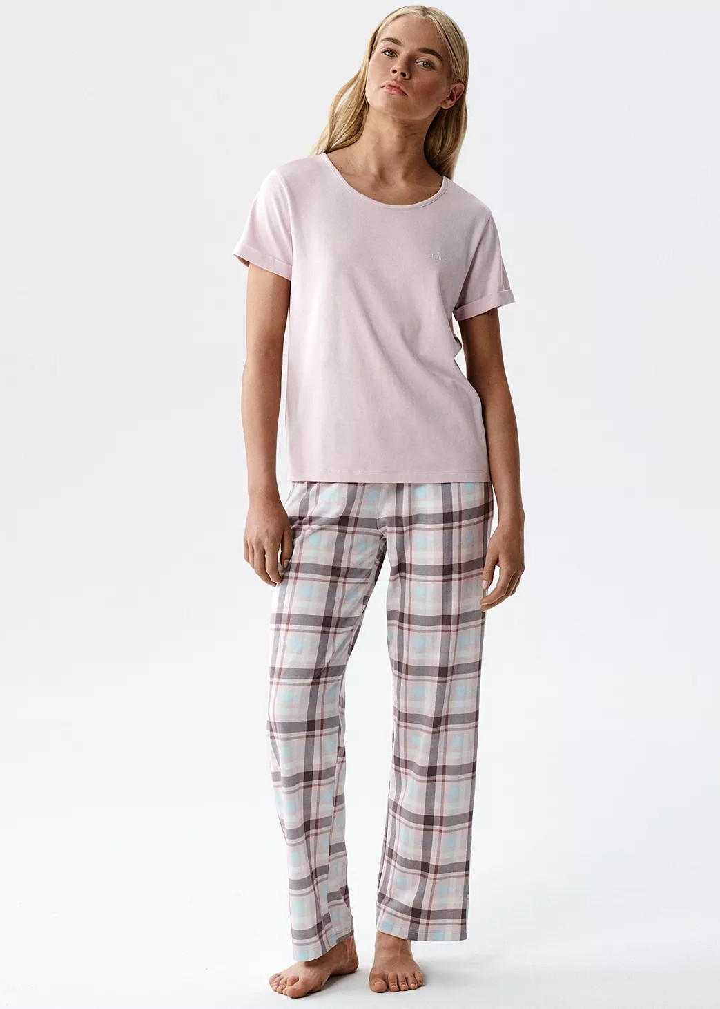 Повітряна, неймовірно м'яка та приємно прохолодна на дотик, ця жіноча піжама має футболку прямого крою з ледь закасаними рукавами. Штани мають довгі, вільні, прямі штанини. Тканина: 50% модал, 50% бавовна.