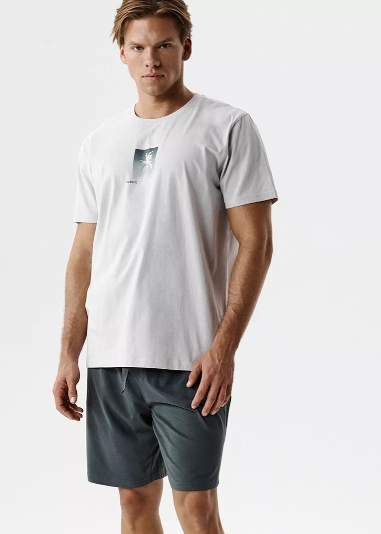 Ця піжама виготовлена з високоякісної бавовни з персиковим ефектом — м’якої, легкої та приємної для шкіри. Футболка з короткими рукавами та шорти мають застібку на шнурок та практичні кишені. Склад: 100% бавовна.