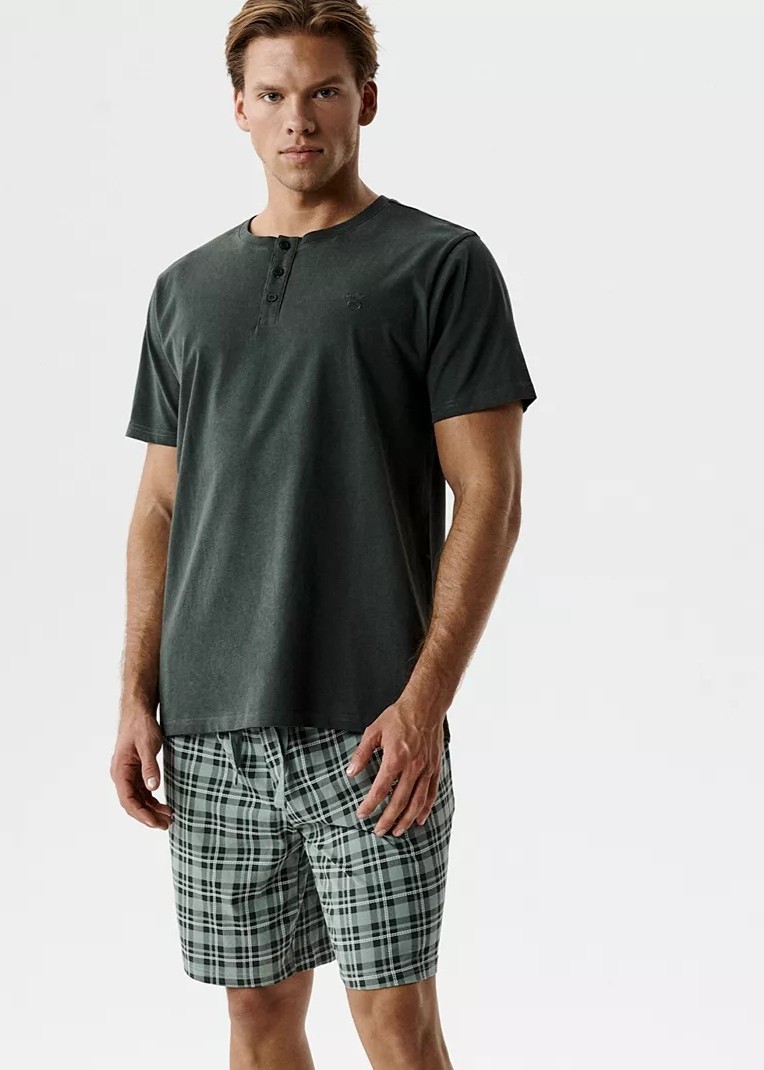 Ця піжама виготовлена з високоякісної бавовни з персиковим ефектом — м’якої, легкої та приємної для шкіри. Комплект включає футболку з короткими рукавами на ґудзиках та шорти з регулюванням за допомогою шнурка та практичними кишенями. Склад: 100% бавовна.