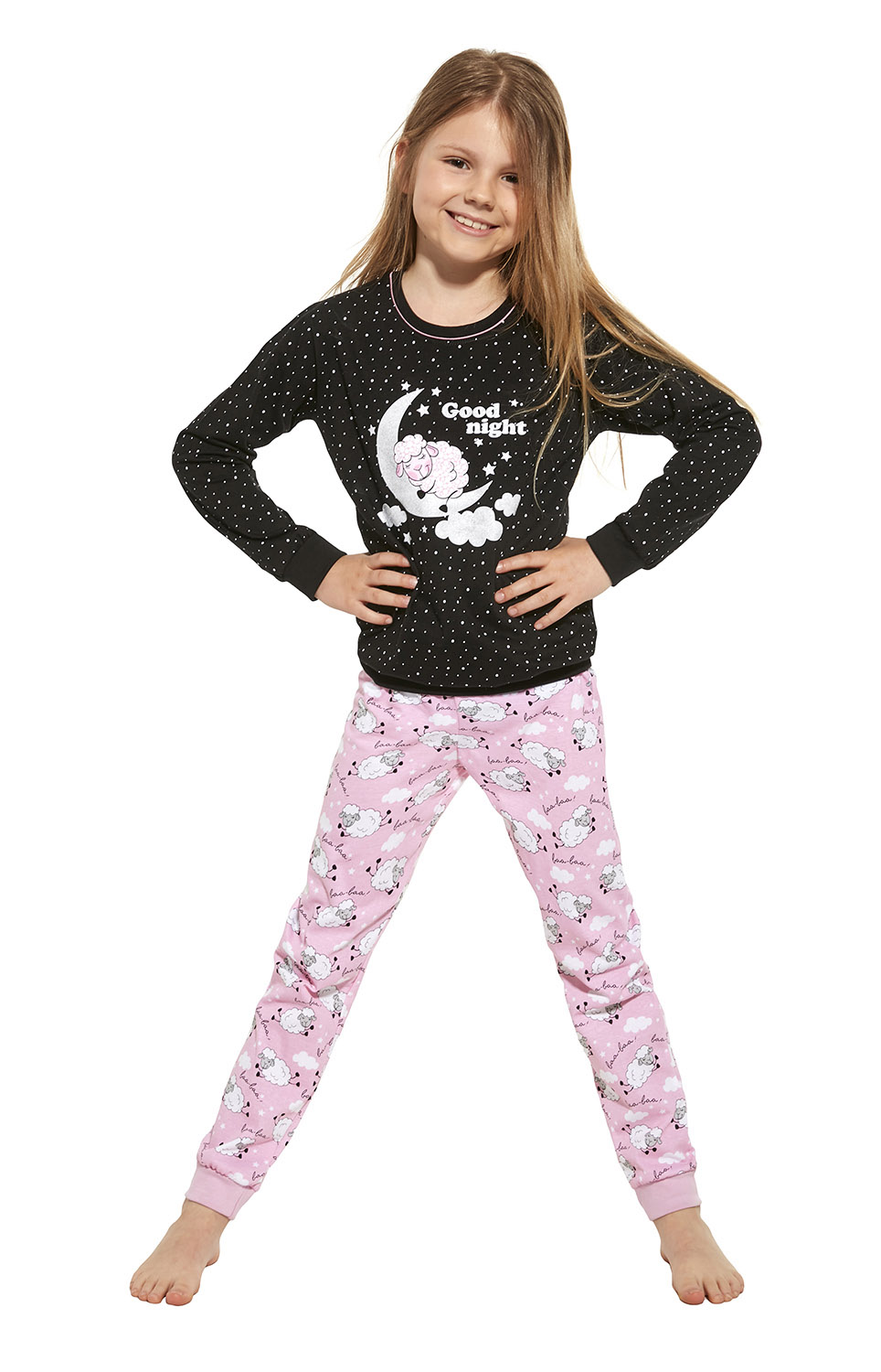 Зручна піжама для дівчинки з приємної м'якої бавовни. Футболка з довгими рукавами в крапку, спереду прикрашена кольоровим принтом. Довгі брюки з малюнком. Низ сорочки, манжети і штанини оброблені манжетами. Склад: 100% бавовна.