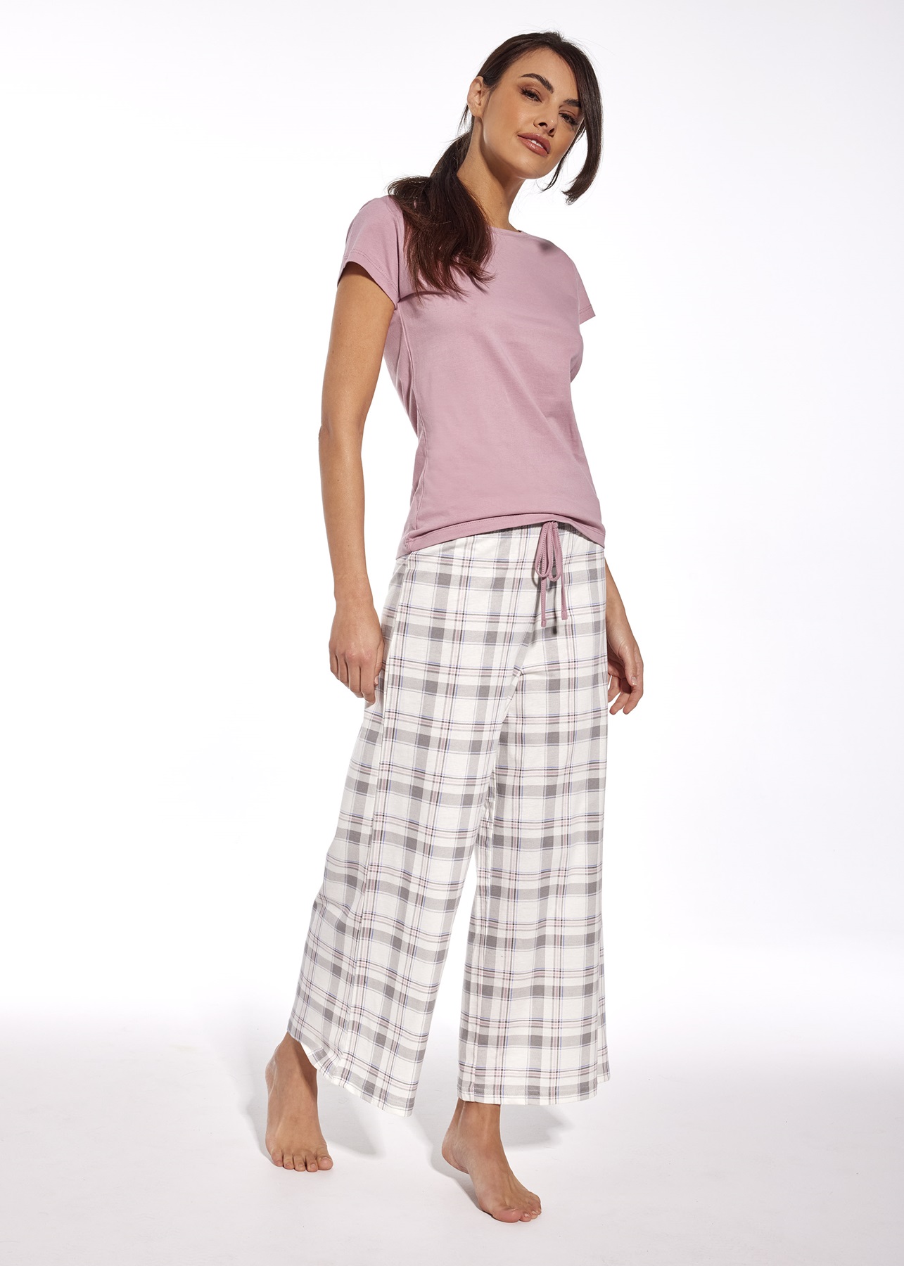 Жіноча піжама з футболкою з коротким рукавом і довгими брюками з дуже широкими штанинами. Блуза має круглий виріз горловини, а штани мають світлу клітку. Виготовлена з ніжної, якісної бавовни. Склад: 100% бавовна.