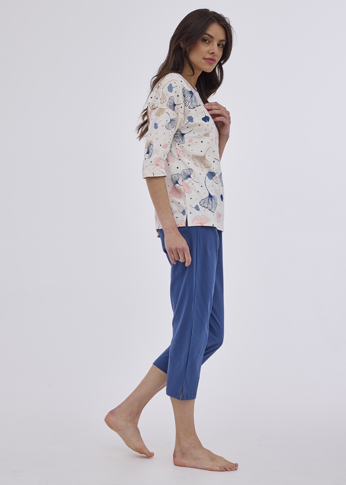 Жіноча піжама з високоякісної бавовни. Сорочка з візерунком, круглим вирізом і рівномірною окантовкою, рукав 3/4. Штани формені, довжина 7/8. Склад: 100% бавовна.