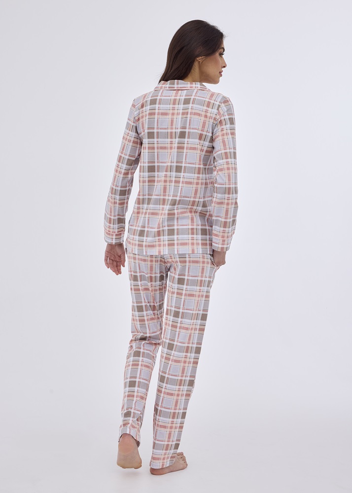 Жіноча піжама з якісної клітчастої бавовни. Футболка з довгим рукавом, коміром і гудзиками. Довгі штани зі зручними кишенями та еластичним поясом, обробленим бавовною. Склад: 100% бавовна.