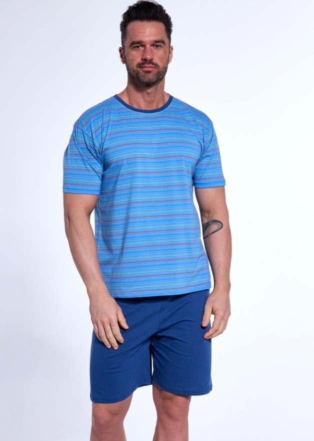 Чоловіча піжама з високоякісної, дихаючої бавовни. Футболка з короткими рукавами в елегантні, класичні смужки. Однотонні шорти в тон. Вільний крій. Склад: футболка 85% бавовна, 15% поліестер; штани 100% бавовна.