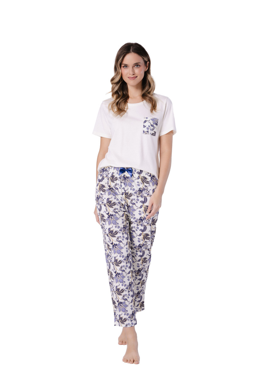 Елегантна та зручна жіноча піжама LEVEZA IRENA 1737 – ідеальний вибір для жінок, які цінують комфорт та високоякісні матеріали. Виготовлена зі 100% рафінованої бавовни, вона надзвичайно м’яка, дихаюча та приємна до шкіри. Верх класичного крою має круглий виріз горловини та короткі рукави, що робить його ідеальним для теплих вечорів. Тонким декоративним акцентом є контрастна кишеня, яка додає сучасного вигляду. Штани довжиною 7/8 забезпечують комфорт та свободу рухів. Квітковий візерунок надає їм жіночності, а декоративний бант на талії підкреслює витончену привабливість комплекту. Поєднання світлого верху та темно-синіх акцентів створює гармонійний, елегантний образ. Піжама доступна в розмірах від M до 2XL, що дозволяє легко підігнати її до вашої фігури.