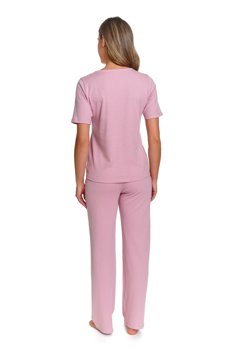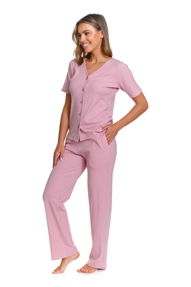 Жіноча піжама DR NAP – це зручний та стильний комплект, розроблений для комфортного сну та відпочинку вдома. Комплект включає топ на ґудзиках з короткими рукавами та довгі штани, що забезпечують свободу рухів та комфорт протягом усієї ночі. Виготовлені зі 100% ребристої бавовни, вони м'які, дихаючі та приємні до шкіри. Натуральний матеріал забезпечує належну циркуляцію повітря, що робить їх придатними для будь-якої пори року. Ніжна ребриста структура тканини надає комплекту сучасного та елегантного вигляду. Верх має жіночну застібку на ґудзиках та V-подібний виріз горловини, що підкреслює силует та додає витонченості. Довгі штани зручного крою забезпечують комфорт та свободу рухів під час сну та відпочинку вдома. Ребриста бавовняна піжама DR NAP – ідеальний вибір для жінок, які цінують натуральні матеріали, комфорт та позачасовий стиль.