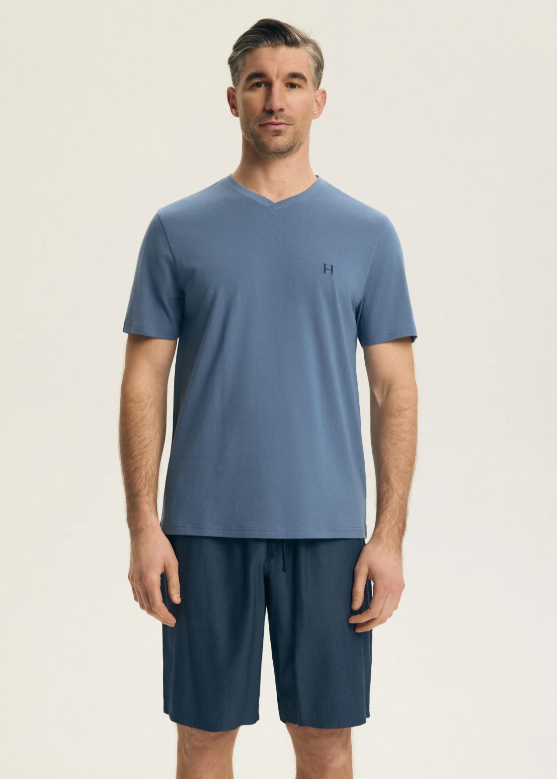 Чоловіча піжама з м'якої, дихаючої бавовни. Футболка з V-подібним вирізом та короткими рукавами. Однотонні шорти до коліна. Склад: 100% бавовна.