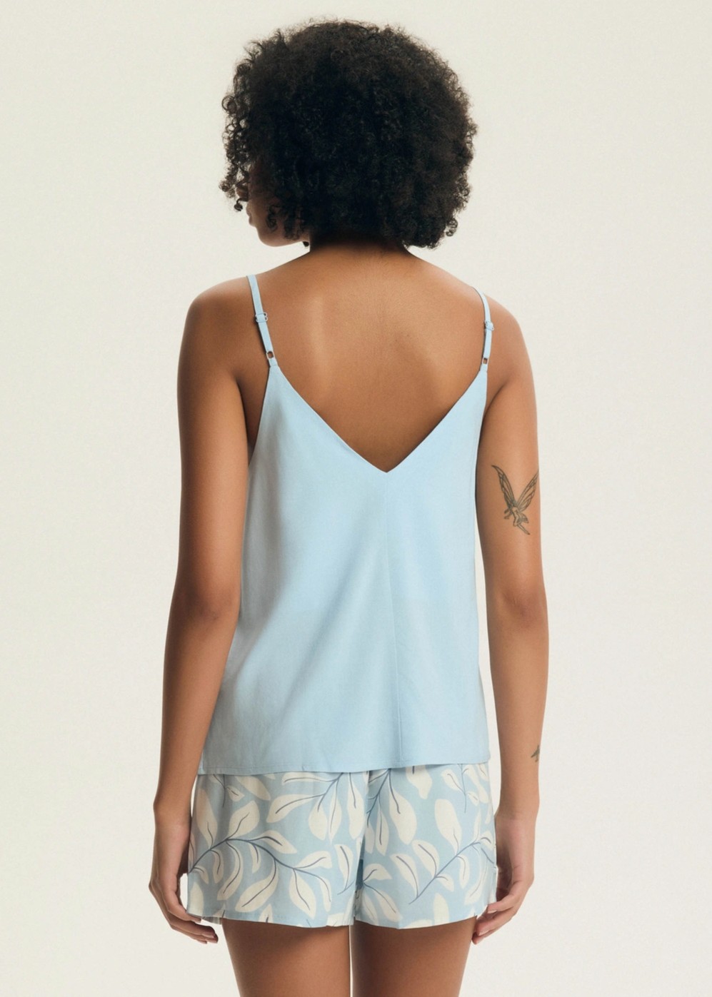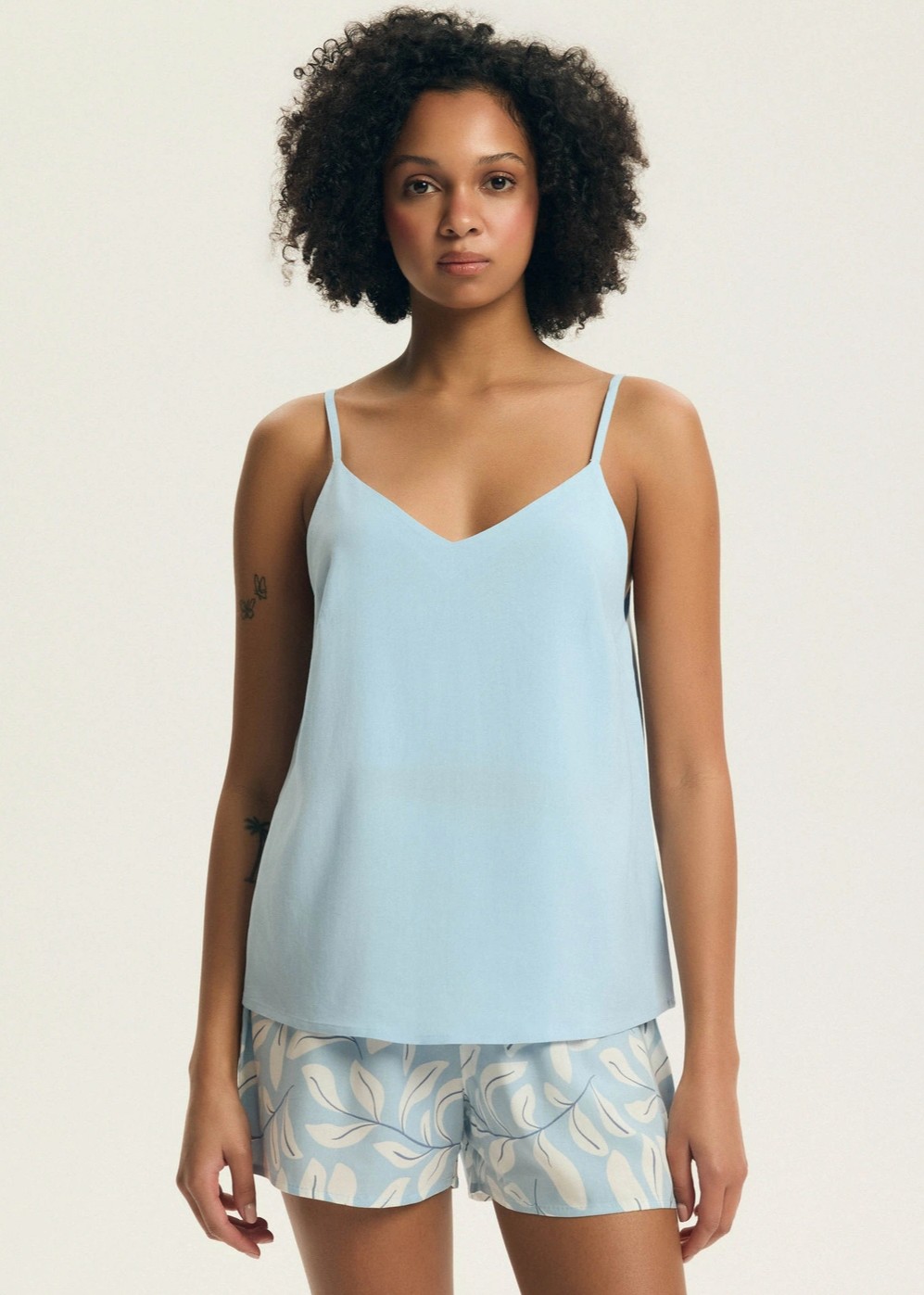 Жіноча піжама з віскози вільного крою. Однотонний верх на бретельках ідеально драпірується. Доповнюють комплект шорти вільного крою з квітковим візерунком. Склад: 100% віскоза.