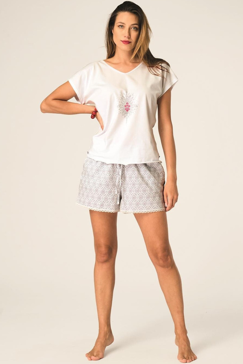 Жіноча піжама з короткими рукавами. Блузка вирізняється ніжним принтом та блискучими стразами, V-подібним вирізом горловини та спинкою. Шорти оздоблені візерунком та мереживом. Склад: 95% бавовна, 5% еластан.