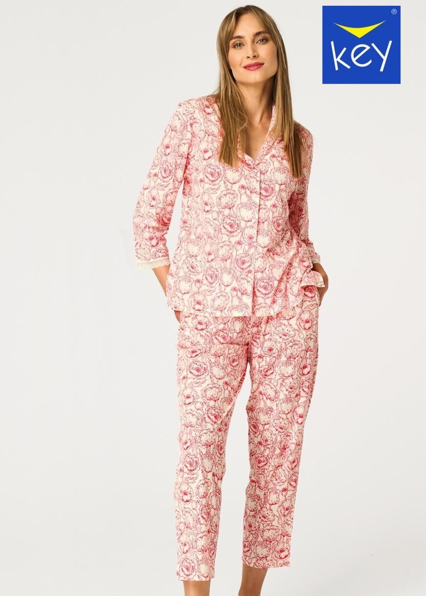 Жіноча бавовняна піжама з квітковим принтом. Топ з коміром, рукавами 3/4 та мереживною обробкою, застібається на ґудзики. Штани довжиною 7/8 мають кишені на стегнах. 100% бавовна.