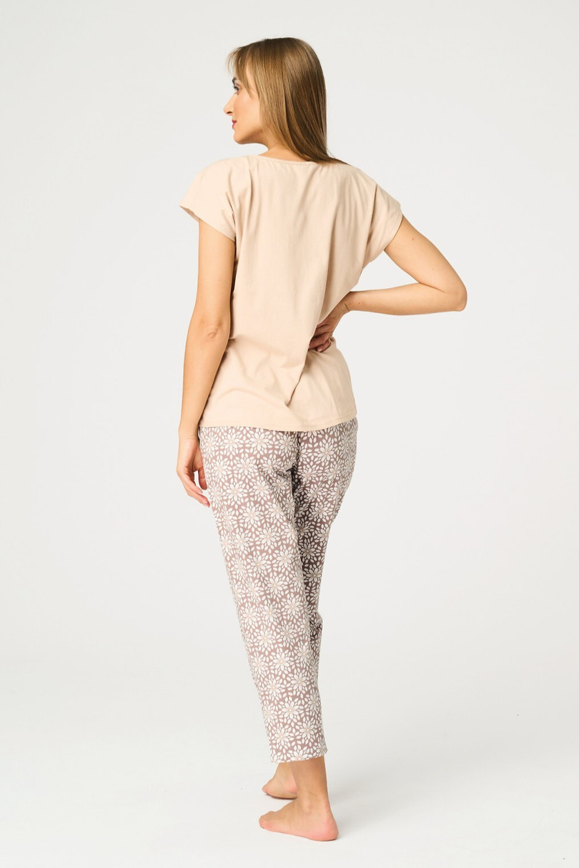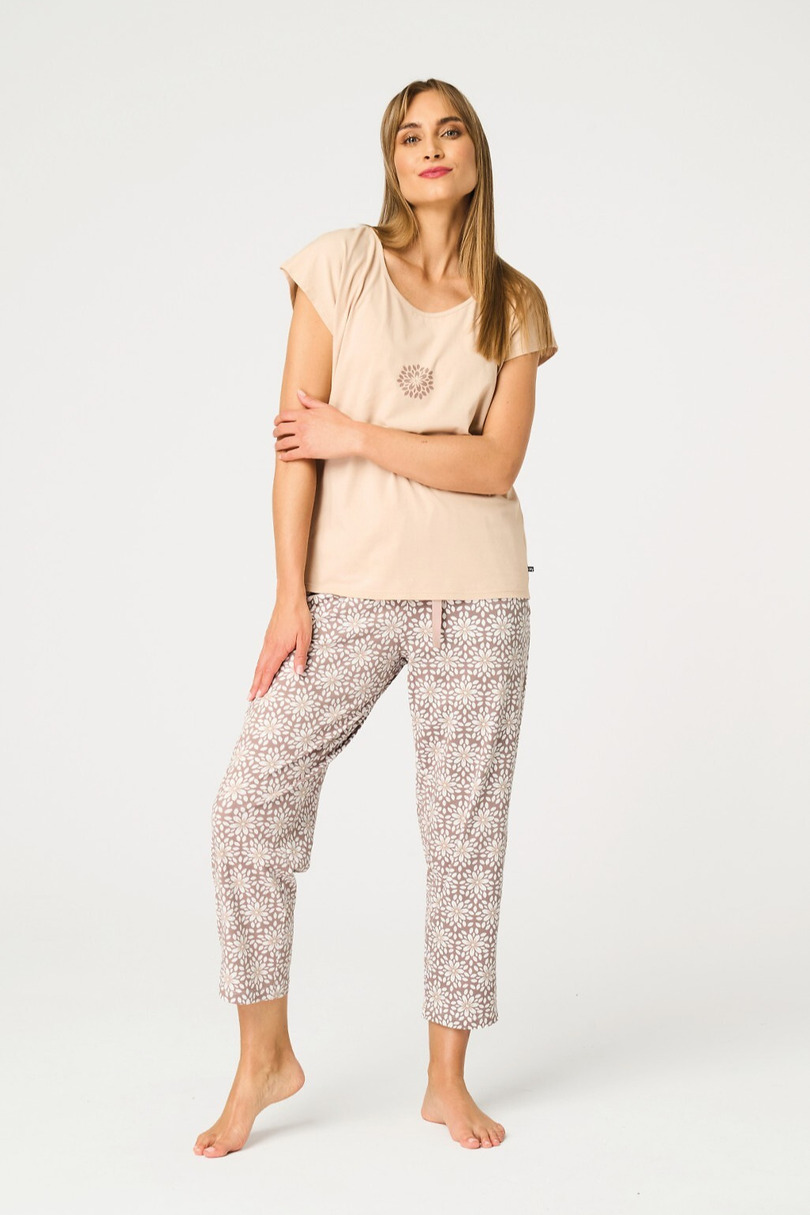 Жіноча піжама з високоякісної бавовни. Блузка з короткими рукавами з ніжним принтом та блискучими стразами. Штани 7/8 з візерунком, вільні та прямі. Склад: 95% бавовна, 5% еластан.