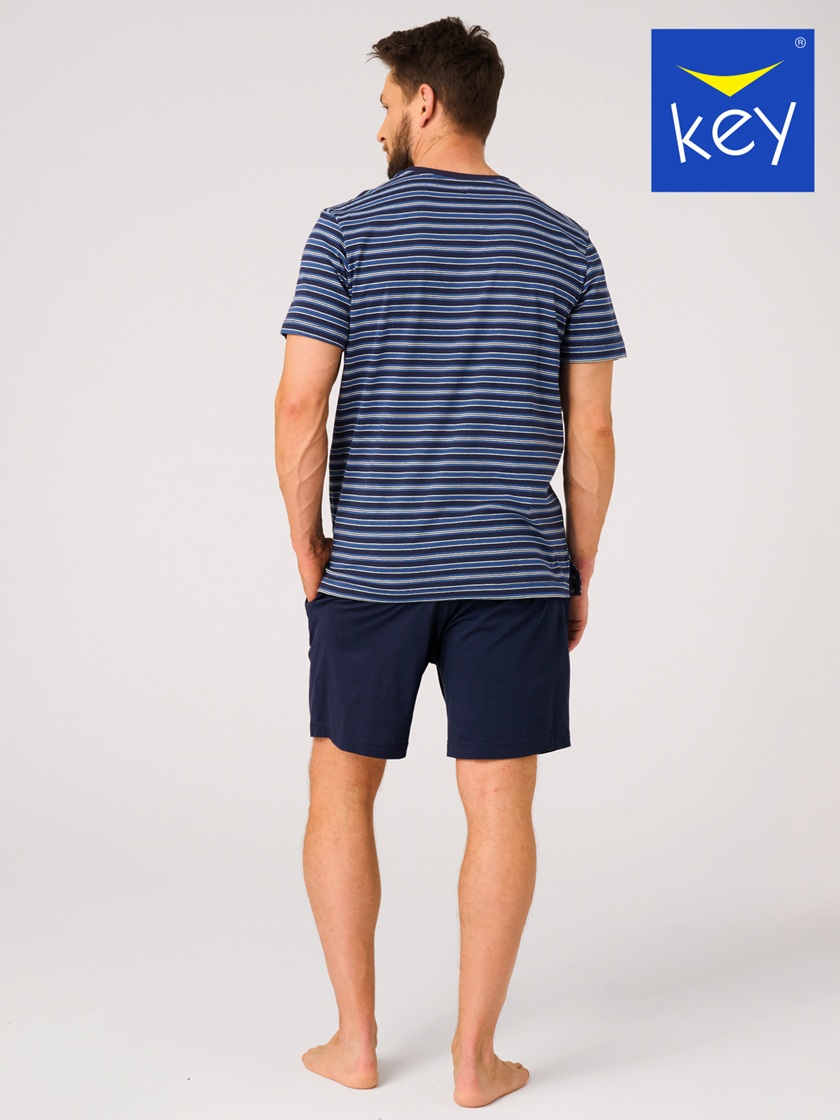 Чоловіча піжама з високоякісної, вишуканої, антиалергенної бавовни забезпечує чудову повітропроникність та комфорт. Футболка з короткими рукавами в тонкі смужки. Короткі, однотонні шорти зі зручними кишенями. Склад: 100% бавовна.