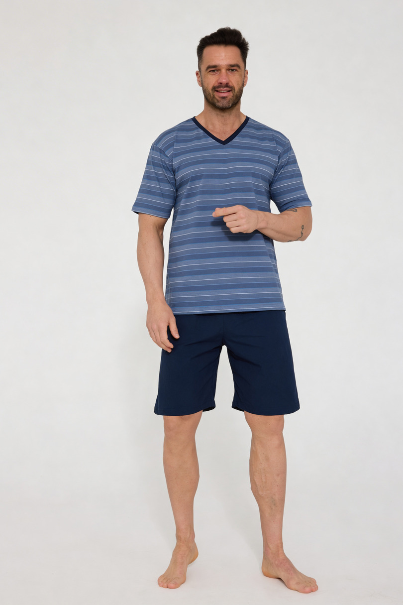 Чоловіча піжама KR 330 W/26 – це класичний та зручний варіант для теплих вечорів, що поєднує в собі позачасовий стиль та високий комфорт. Модна футболка з короткими рукавами в смужку та V-подібним вирізом надає виробу елегантного, чоловічого вигляду та забезпечує свободу рухів. Суміш бавовни та поліестеру м’яка, приємна на дотик та стійка до розтягування. Короткі однотонні шорти, виготовлені зі 100% натуральної бавовни, гарантують повітропроникність та комфорт навіть у спекотні ночі. Еластичний пояс з бавовняною обробкою ідеально прилягає до тіла, не створюючи тиску. Піжама KR 330 W/26 – чудовий вибір для сну та відпочинку вдома, а також є практичним подарунком для чоловіків.